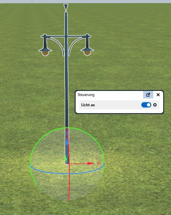 Z.Z. ist es eine Straßenlampe, sie ist fertig und sollte auch leuchten, macht sie aber nicht. Unten ein Bild aus Blender. Dem Objekt das leuchten soll habe ich als _PointLight_Lampenglas li benannt, aber im MBS ist nur einer kleines Glimmen zu sehen.