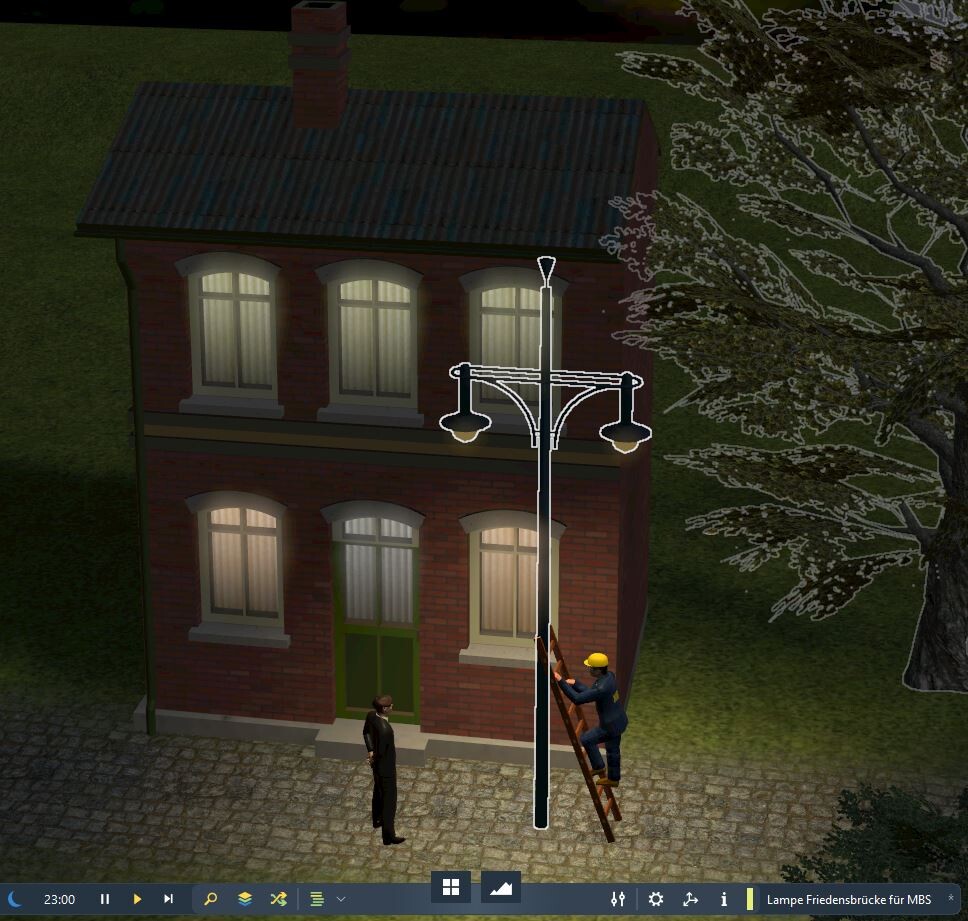 Ich habe noch einmal an der Lampe gearbeitet, jetzt mit einem Spotlight und die Lampengläser mit einer Emissive aus Blender versehen. Es sieht auch ganz gut aus (Bild unten) das Licht kann man im MBS ganz nach Bedarf aus und einschalten aber die Gläser leuchten auch am Tag. Es scheitert bei mir also noch an der Emissive Textur dabei brauche ich Hilfe.