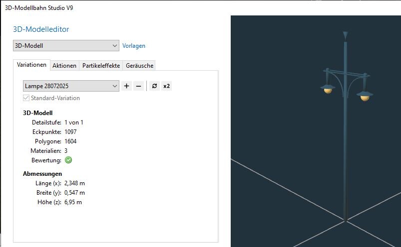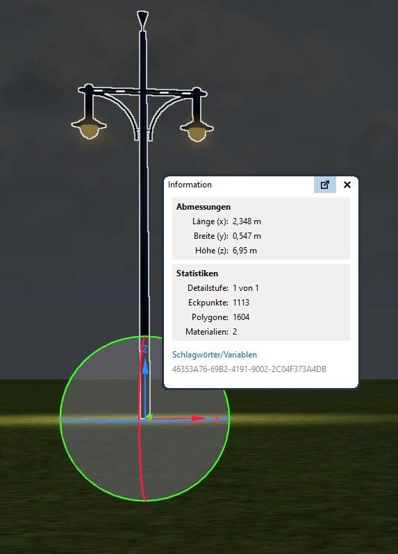 Mit dem neu erstellten Modell (noch nicht Veröffentlicht) gibt es keine Probleme, es funktioniert wie es soll. Unten zwei Bilder mit Tag/Nachaufnahme und zwei Bilder mit den Einstellungen für den Katalog. Aber jetzt noch einmal eine ganz andere Frage. Diese Lampe hat nach Blender 861 Vertex, wäre da noch eine kleinere LOD Stufe angebracht?