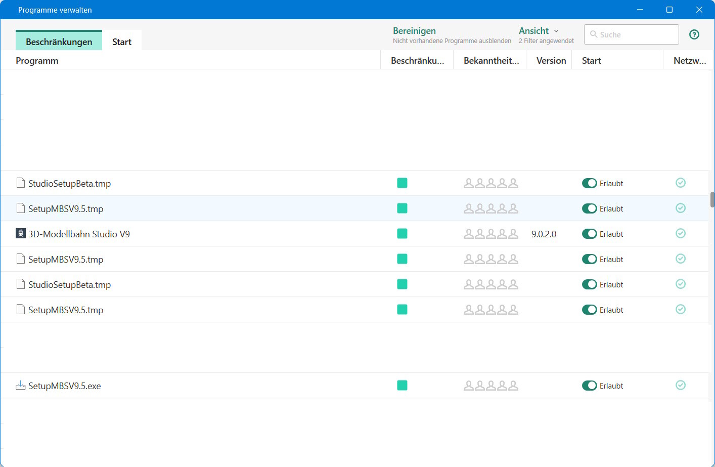 Ich sehe auf deinem Bild nicht, dass du für Version V9.5 eine Freigabe erteilt hast. Du hast dem Setup-Programm freien Zugang gewährt, nicht aber dem eigentlichen Programm "3D-Modellbahn Studio V9.5".