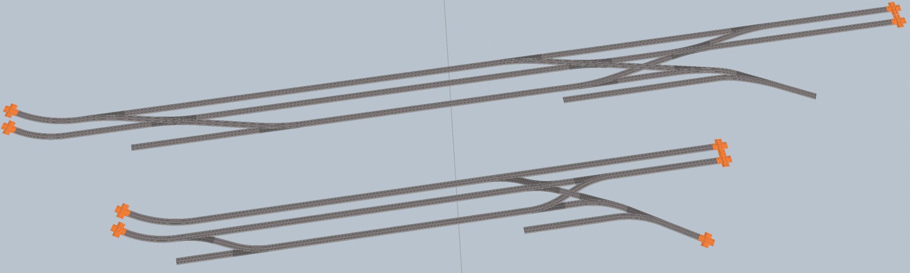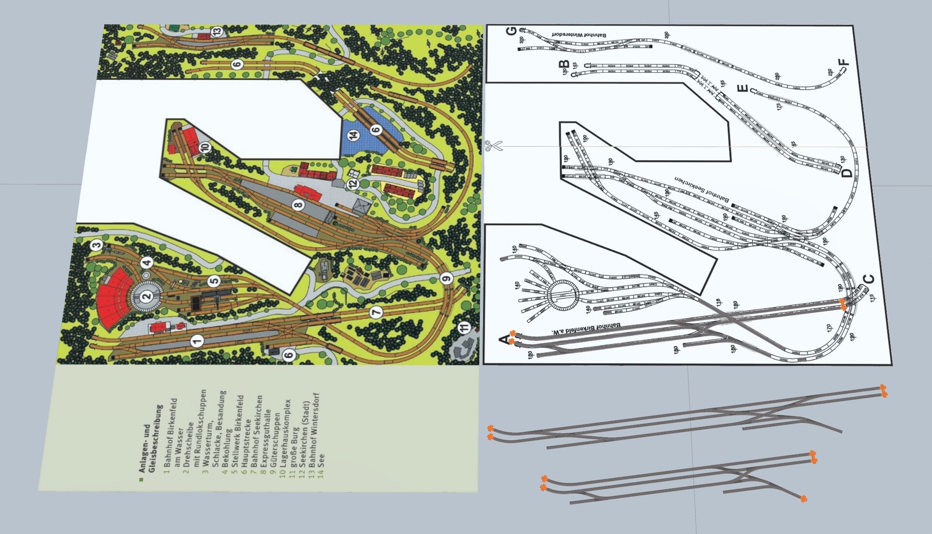 Die o.g. Anlage soll mit Märklin C-Gleis und schlanke Weichen gebaut werden. Um mit schlanken Weichen ausreichende Längen im Bahnhof (hier: Birkenfeld a.W.) zur Verfügung zu haben, muss die Anlage verlängert werden. Weiterhin braucht es für eine Durchfahrt oder Einfahrt auf Gleis 3 aus Richtung C in den Bahnhof 2 DKW. Hier wurde der Gleisplan erweitert.