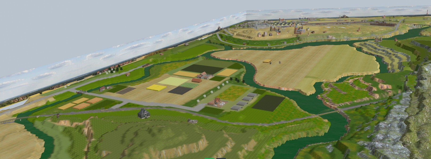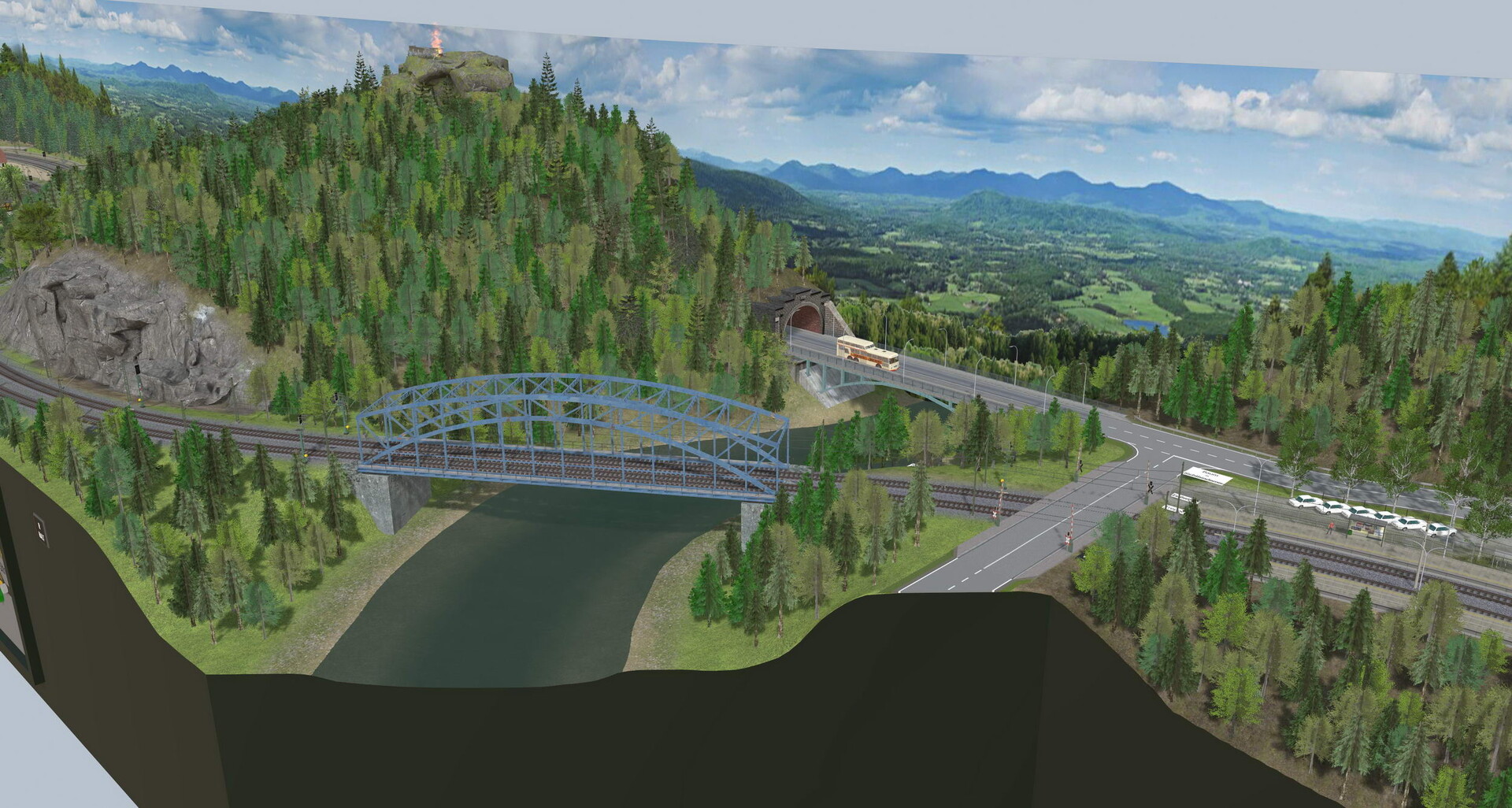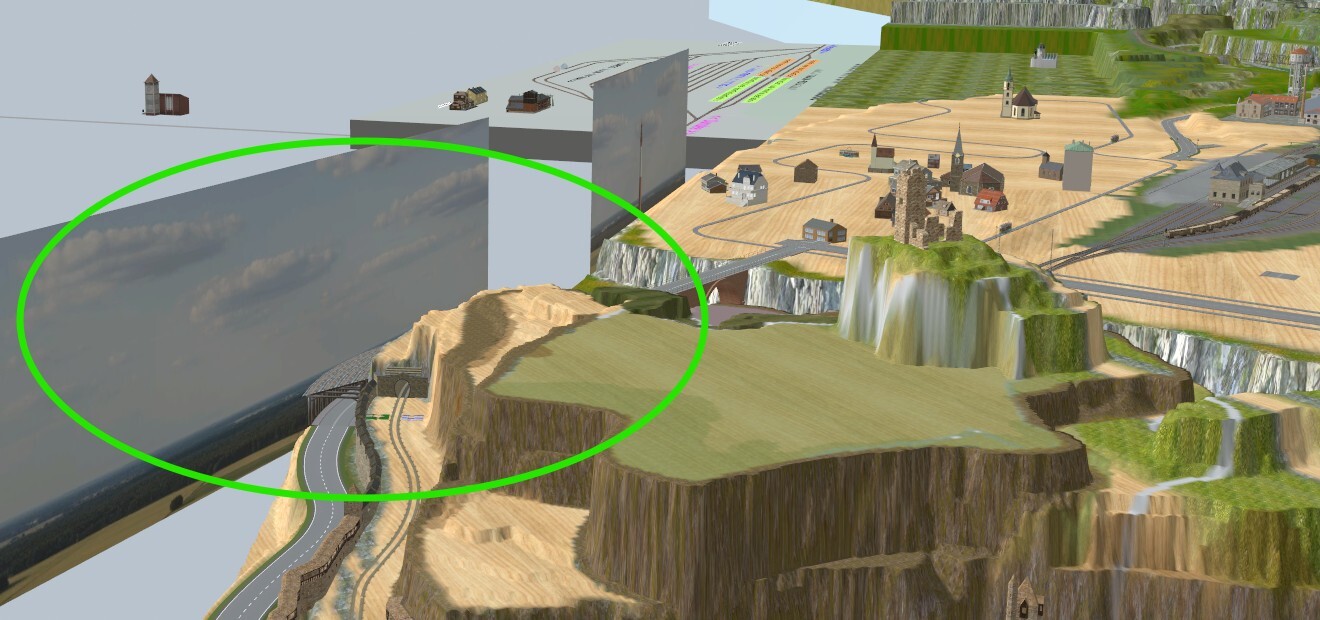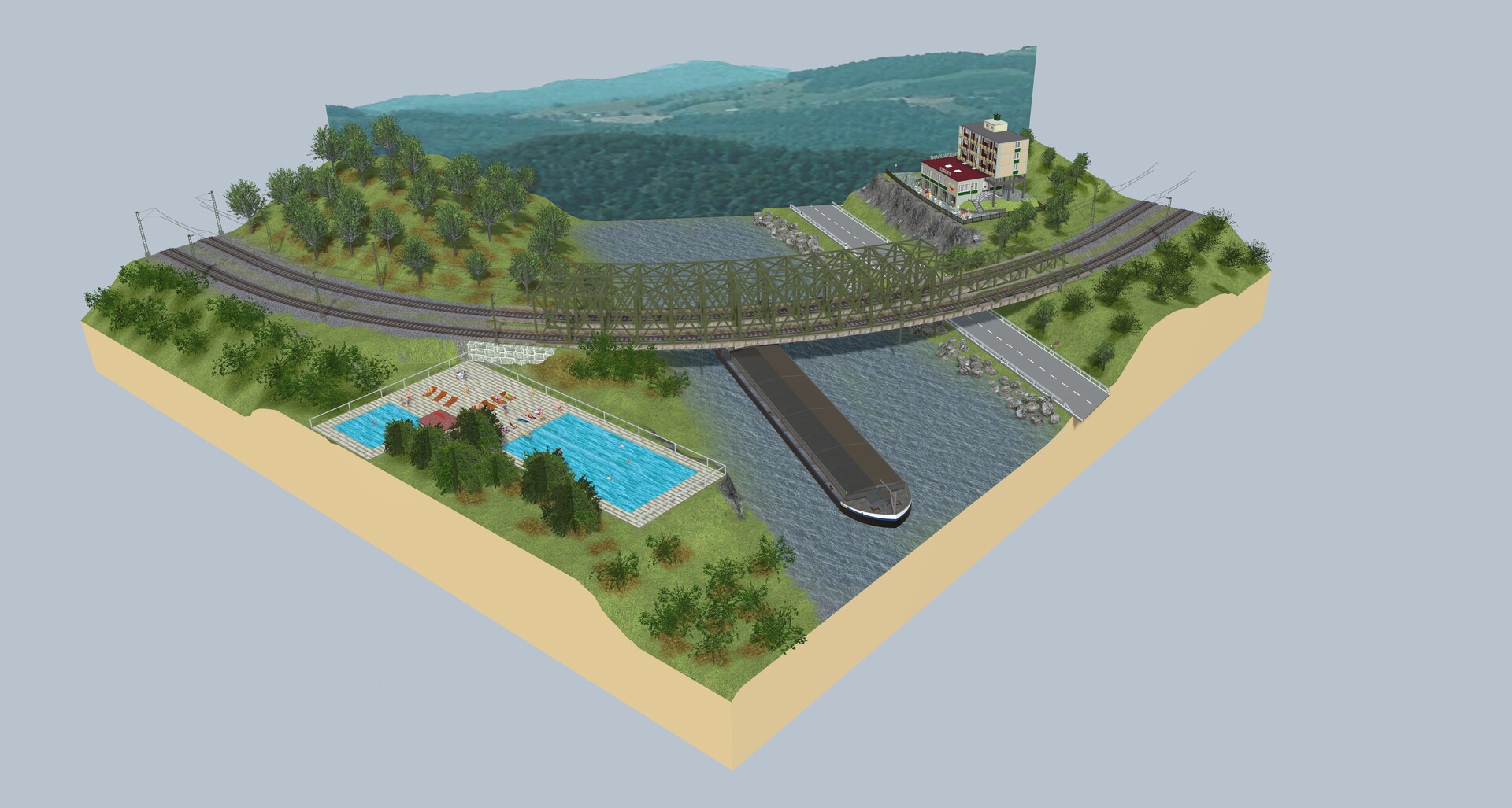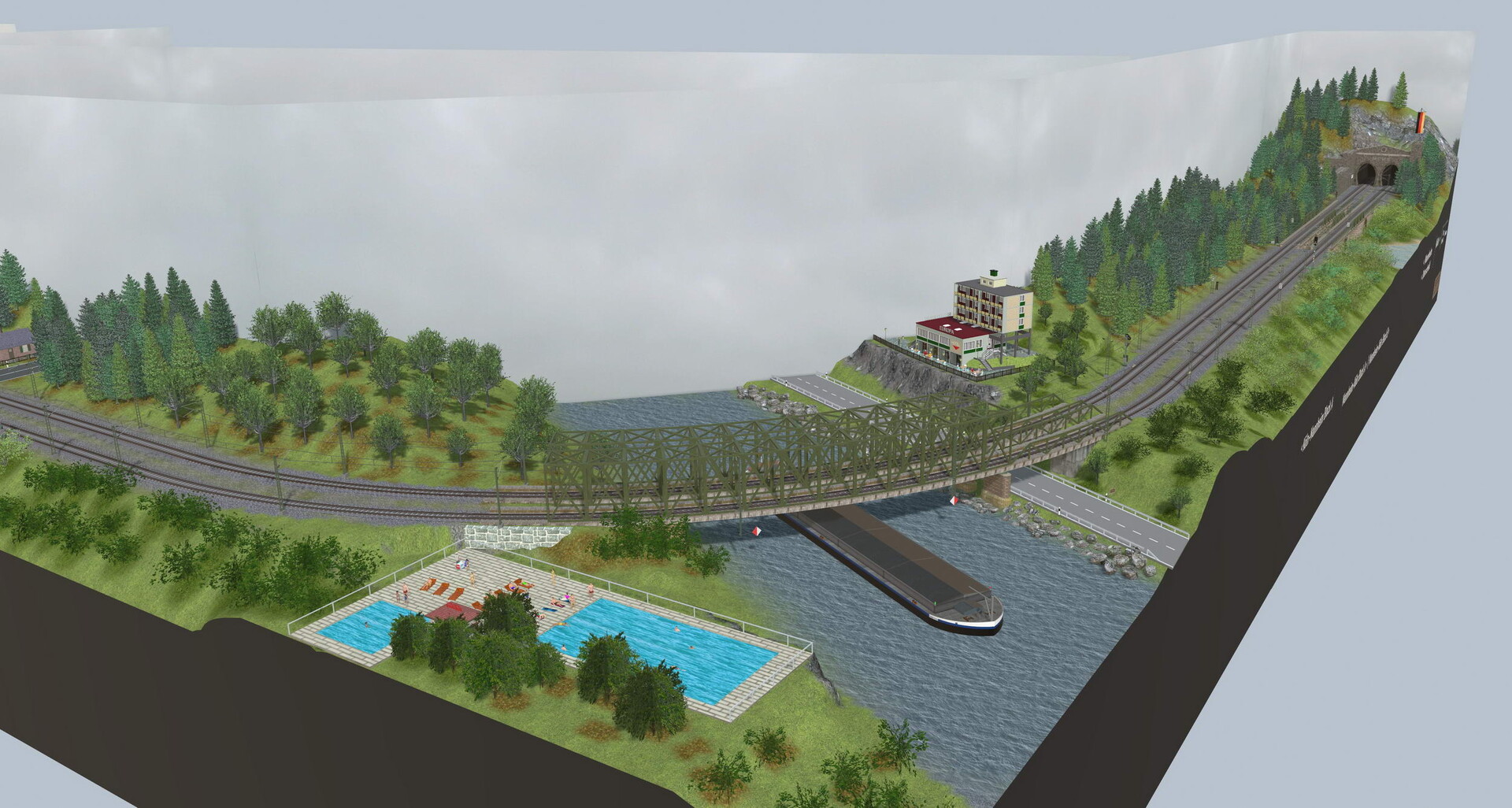 Auf meiner Dierscheid-Anlage habe ich den Hintergrund durch einen einfachen Wolkenhimmel ersetzt. Damit endet der Fluss praktisch am "Horizont", und so fallen zumindest keine störenden Kulissenelemente auf. Für mich ist das ein akzeptabler Kompromiss.