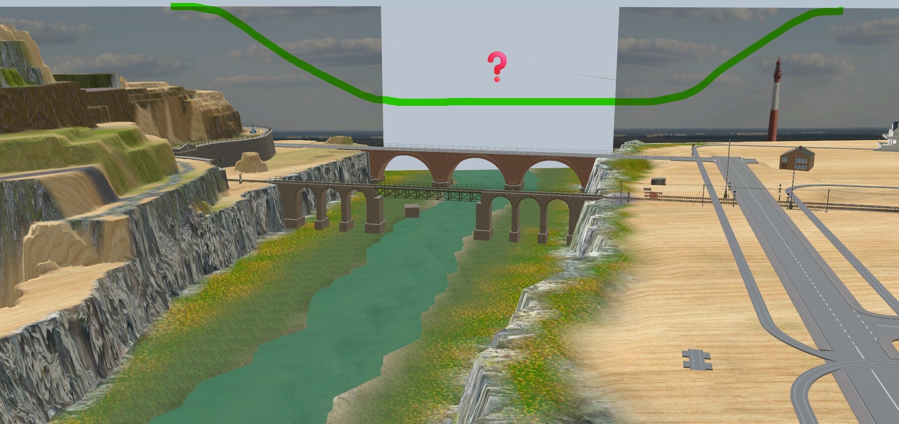 Habe da früher schon experimentiert aber so richtig wollte das nicht. Am schönsten war es noch mit dem aufmalen eines Flusses der sich dann proportional natürlich verschmälert und eventuell Bäume an den Ufern. Die Brücke müsste dann aber ziemlich knapp an den Hintergrund so wie im Bild. Vielleicht auch noch etwas Nebel.