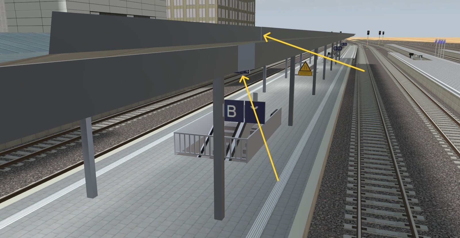 Der Text des Schildes über der Rolltreppe wird auch auf der Fläche des Bahnsteigbodens (mehrmals) angezeigt. Liegt es daran, dass für das Schild selbst die kleinere Texturdatei verwendet wurde, für die Bemalung von Rahmen und Aufhänger aber die große Multitexturdatei? Die Texturen haben unterschiedliche Namen, BstA.png für die große Datei und Schilder.png für die kleine Datei. Oder liegt es daran, dass nur eine Datei als Basisdatei akzeptiert wird? Aber dann dürfte die Texteingabe ja nicht auf dem Rolltreppenschild erscheinen, was sie aber macht. Wo also liegt der Fehler?