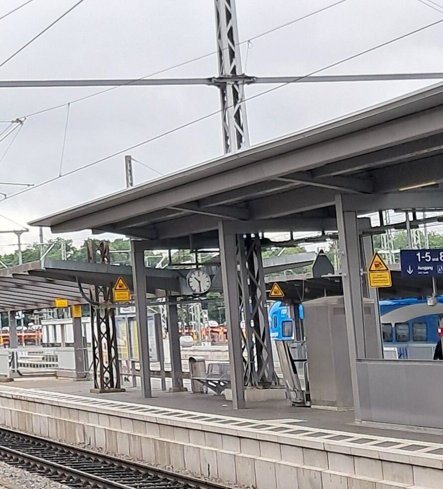 Wie Du an diesem Bild erkennen kannst, steht der Strommast nun mittig auf dem Bahnsteig, hier ein Ausschnitt des Bildes: