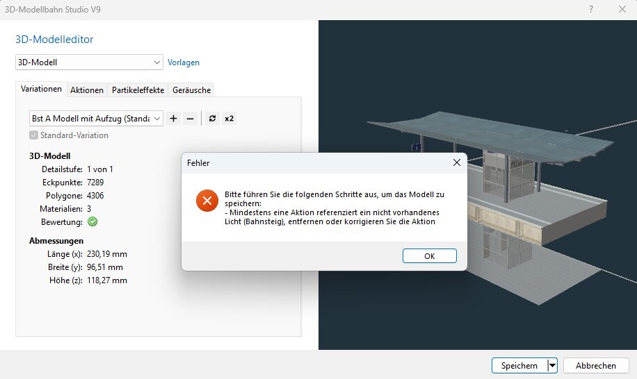 inzwischen hat sich das Problem gelöst, ich habe das Modul mit den Rolltreppen entfernt, dann erneut hochgeladen und anschliessend das Modul Aufzug hochgeladen. Da nahm es das MBS dann an, obwohl ich auch zuvor noch zwei Versuche hatte, welche die besagte Fehlermeldung brachten. Wo das Licht Bahnsteig referenziert ist, das siehst Du hier
