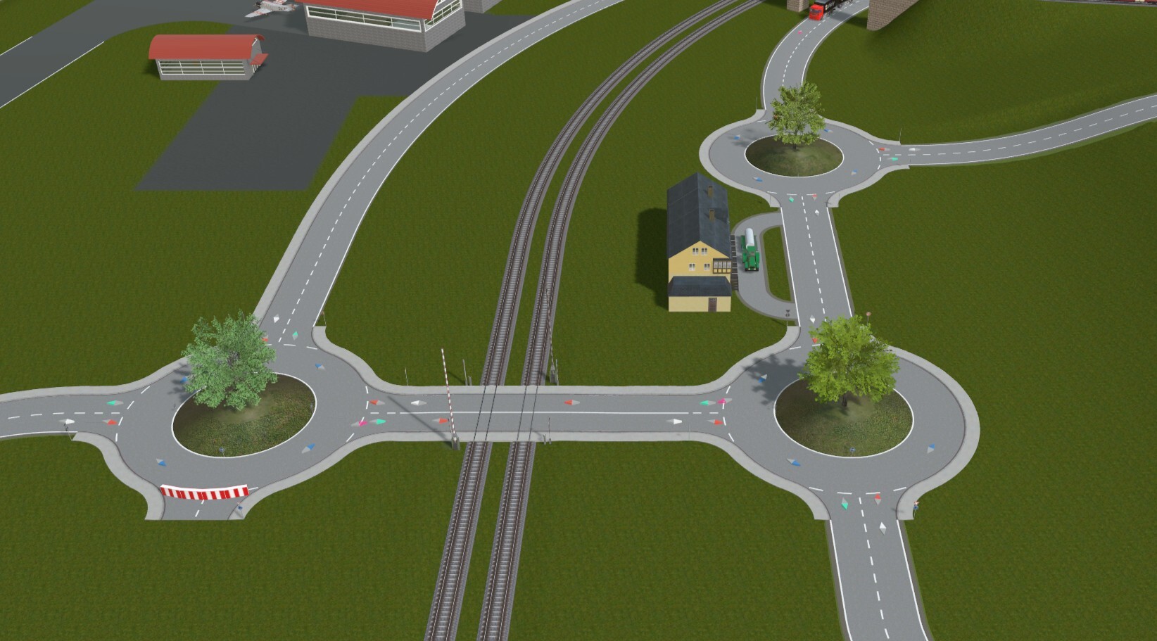 ich habe eine andere Lösung für das Problem. In den Fällen, wo zwei Einmündungen zu dicht beieinander liegen, ersetze ich eine durch einen Kreisverkehr. Da ist die "Vorwarnzeit" nicht so weit voraus. Der Trend geht ja im Straßenverkehr sowieso weg von Kreuzungen und Einmündungen hin zu Kreiseln. Ist ja auch irgendwie flüssiger im Ablauf. Funktioniert sogar mit je einem kleinen EV-Zusatz für zwei Kreisverkehre mit Bahnübergang dazwischen (siehe Anhänge). Als Nächstes will ich probieren, ob ich bei einer Ampelkreuzung nach Vorbild von Goetz's "Kreuzungen und Einmündungen" (aber ohne Linksabbiegespur) die Vorfahrt in den beiden freigegebenen Richtungen hinkriege. Das hatte ich schon mal versucht, ist damals aber noch nicht gelungen. Jetzt probiere ich es noch mal mit den geteilten Straßen wie bei der Eimündung.