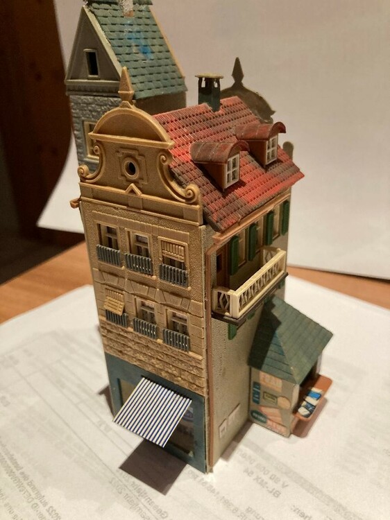 Hallo Andy, dein Hilfsmodell habe ich mit 0,5 skaliert, damit es zur Apotheke in etwa passt. Die Erika hat am Modell von Faller eine Giebelbreite von 57 mm und eine Firsthöhe von 81 mm. Gebäudelänge ist 81 mm und Seitenwand Höhe bis Dachkante sind 57 mm. Das kann ich am Modell messen. Foto vom Erika Schriftzug kann ich dir auch machen. Was brauchst du noch? Gruß Lothar