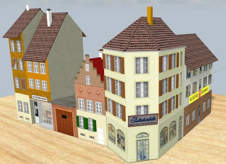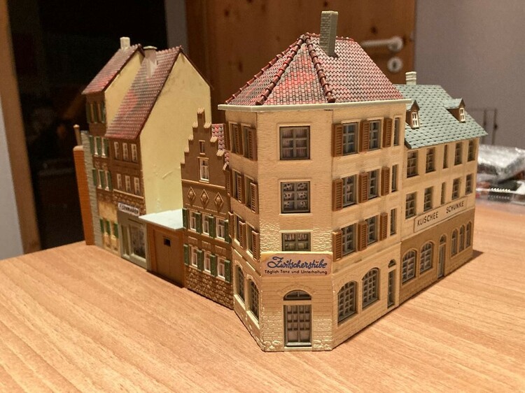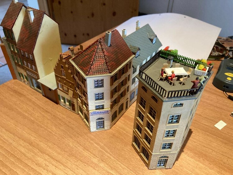 Hallo zusammen, Faller B-925 ist gewachsen. Habe noch ein paar Lichter in der Planung und vom 5eck Haus Variationen ohne Fensterläden und eine mit Flachdach. Beim abgesetzten Haus gibt es einen Kontaktpunkt für eine 4 m Markise von @fmkberlin, die beim Skalieren auf 0,5 die richtige Position findet. Ich könnte noch _CP's einbauen, dass die einzelnen Gebäude in der Aufstellung laut Faller Packung zusammen schnappen. Was haltet ihr davon? Kommentare und Vorschläge sind willkommen. Abgesetztes Haus: ECCA6BFE-B429-4EBA-A549-CE1A7B9A8AB3 Garage: 854DFFB7-054A-4167-8BC3-27EAA58FACDA Kleines Haus: 70B1793C-EA75-43CC-BBAA-0647D6979977 Fünfeck Haus: C2B18889-2DFA-4583-A960-08DC600762ED Schunke: 3C04CAFE-7A52-4049-AE58-1CA317168658 Schöne Grüße Lothar P.S.: Wieder Bildvergleich zum Original. Das letzte waren die Bordmittelbauten