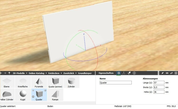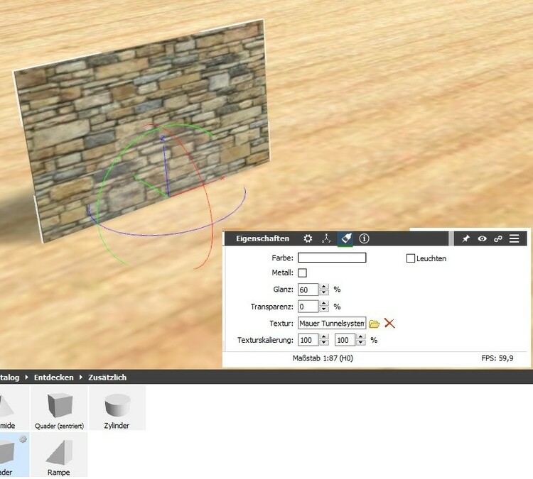 Hallo Helmut, mit Bordmitteln bzw. Grundkörpern baut man direkt im Studio. Ich habe mir dazu immer eine Platte 500 x 500 mm und 19 mm dick erstellt. Ich habe immer in 1:87 gebaut, da ich dann am den Faller Modellen, die ich habe genau nachmessen konnte. Habe mal 3 Screenshots gemacht, wie ich einen Quader als Mauerwerk erstellt habe. Zuerst den Quader auf die Platte ziehen, dann im Eigenschaftsfenster die Maße anpassen und danach die Textur aus dem Katalog zuweisen. Alle Elemente der Häuschen sind so gemacht. Damit erkennst du schon, wie belastend diese Bauweise für die Grafikkarte ist. Mit der Rampe macht man Giebel und Dreiecke. Wenn du willst können wir gerne mal eine Any Desk oder Team Viewer Sitzung zusammen machen zum Einstieg. Schöne Grüße Lothar