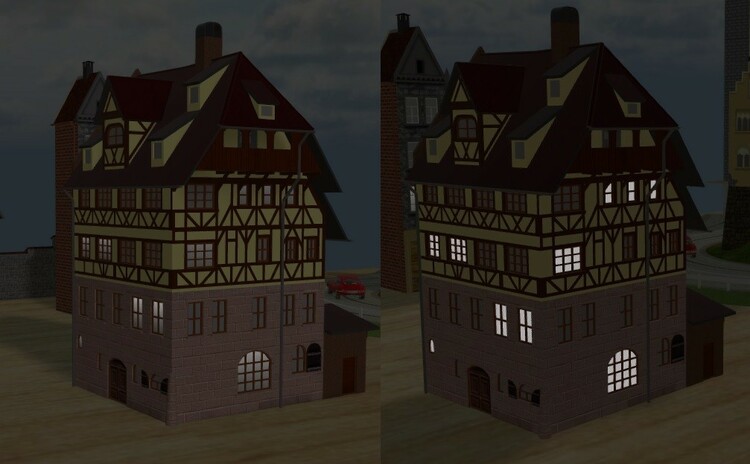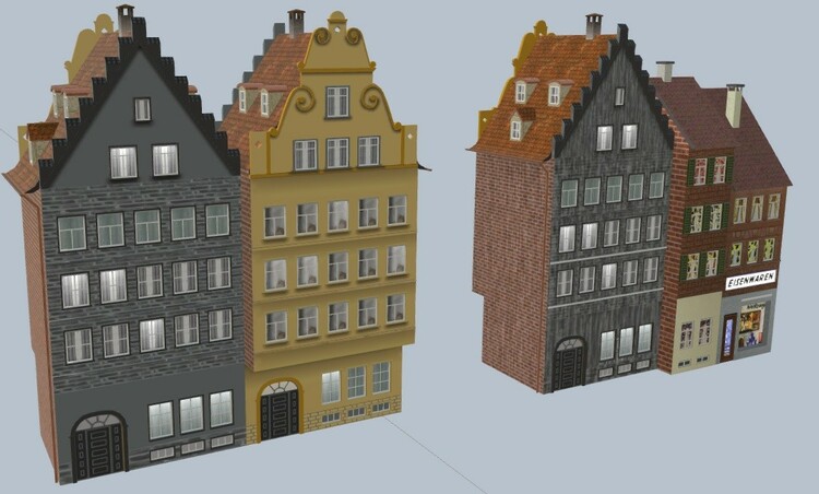 Hallo zusammen, schon wieder Sonntag und Danke für eure Klicks. Habe das große Haus aus B-924 nochmal hergenommen und 2 zusätzliche Variationen gebaut. Eine leicht verschmutzte oder gealterte, die andere mit durchgängig grauem Giebel. Bei allen gibt es Licht und die Gauben und die Dachvorsprünge rechts und links können wahlweise ausgeblendet werden. Damit sind Aufstellvarianten wie im Bild unten, ohne störende Dachvorsprünge möglich. LOD Stufen fehlen leider immer noch, habe es aber neu als Entwurf hochgeladen, zu eurer Begutachtung. Schöne Grüße Lothar ID: 888662E2-1699-4E81-BBD9-0BA08EB3A832