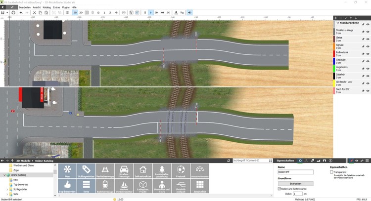 Hallo @Neo, hallo Zusammen bei der 3D-Ansicht, Blick 90° von oben, ist die Darstellung ohne Fehler. Bei der 2D-Ansicht dagegen fehlen einige Dinge, siehe Fotos. Gerade bei den Bahnübergängen arbeite ich viel mit der 2D-Ansicht um besser Markierungen zu ziehen. Ich kann auch gern die Anlage hochladen. Hier die 3D-Ansicht und hier die 2D-Ansicht so sieht es im Programm aus Danke für ein Feedback Internette Grüße Maik