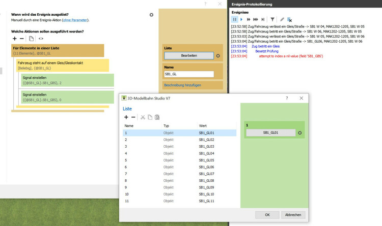 Hallo, ich finde den Fehler nicht ..... vielleicht sieht einer den Wald in den Bäumen. Ich möchte in Abhängigkeit von Betreten oder Verlassen eines Gleises, einen GBS Baustein auf 0 oder 2 setzen. Dazu rufe ich bei Betreten und Verlassen eines Gleises eine Benutzerdefinierte Aktion auf. In dieser Aktion habe ich eine Liste mit den in Frage kommenden Gleisen. Danach frage ich on ein beliebiges Fahrzeug auf einem der Gleise aus der Liste steht. In Abhängigkeit des Resultats wird das GBS Signal auf 2 oder 0 gesetzt. Soweit die Theorie ..... wenn ich es ausprobiere, bekomme ich eine Meldung die ich mir nicht erklären kann. Ich habe mal einen Screenshot angeheftet.