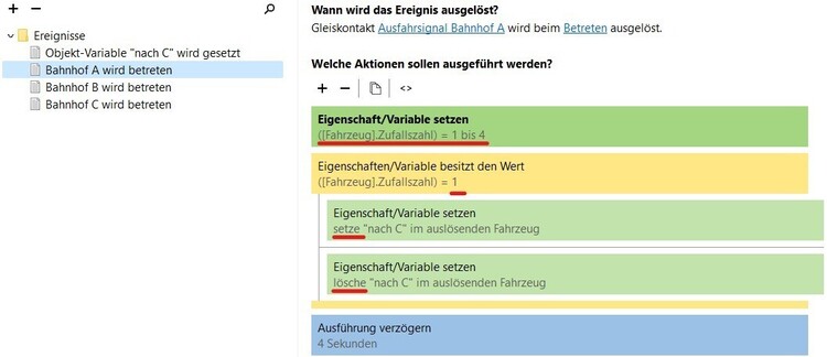 Hallo @ronny_the boos_ schindler, ja das geht. Schau mal hier in der beigefügten Anlage. Von A nach B und C (zufällig).mbp Zur Funktionsweise: Dem Fahrzeug wird zufällig ein Wert zwischen 1 bis 4 zugewiesen. Dieser steht in dem Fahrzeug in der Variable "Zufallszahl". Ist diese == 1, so wird die Variable "nach C" auf wahr gesetzt, andernfalls auf falsch (gelöscht). Durchschnittlich zweigt also der Zug bei jeder vierten Runde nach C ab. Viele Grüße Tim
