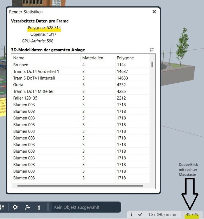 Hallo @jloos, mit einem Klick mit rechten Maustaste auf die FPS-Rate, kannst du die Gesamtanzahl an Polygonen aktuell gerenderten Polygonen in einem Dialogfenster anschauen. Dort sieht du auch aus wie viel Materialien und aus wie vielen Polygonen die einzelne Objekte bestehen. Die Modelle mit den meisten Materialien stehen an erster Stelle. Wenn zum Beispiel ein Modell sehr viele Materialen aufweist kann du ebenfalls mit einem Doppelklick mit der rechten Maustaste auf das entsprechend Objekt klicken und schon ist das Objekt ausgewählt. So kann man wenn man möchte ganz einfach rechnerintensive Objekte löschen oder durch ähnliche Modelle ersetzen etc. Edit: Ich sehe gerade, dass tatsächlich nur die Polygonanzahl der momentan gerenderten Objekte anzeigt werden und nicht die Gesamtanzahl. Vielleicht übersehe ich auch etwas aber vielleicht kann @Neo genaueres dazu sagen. Ansonsten wäre das ein netter Featurewunsch. Viele Grüße, Tim