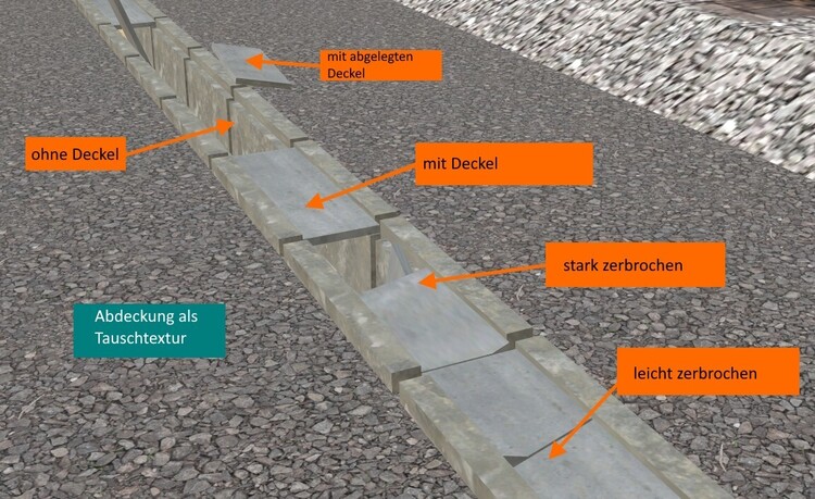 Hallo Alex, ich habe da mal auf die Schnelle was zusammengebastelt. Content ID Kabelkanal: 0619285E-2056-4BA3-B7A1-CE1BAA9C2E37 Content ID Randabdeckung als Tauschtextur: 2E373E9F-BC9A-4A31-9528-EBE88B0D7DE6 Ist das etwa das was du dir vorstellst? Ich habe verschiedene Variationen erstellt. Darunter sind auch gebrochene Abdeckungen. Meinst du mit gebrochen Abdeckungen saubere trennscharfe Kanten, die bewusst in den Kanal eingearbeitet sind, um dort Kabel von außen einzuführen oder Kanten, die man eigentlich nicht will aber durch die Witterung etc. entstehen? Dann gibt es da noch das Problem wenn man die Variante ohne Deckel verwendet, dass die Bodenplatte noch sichtbar ist. Diese legt man dann ja nach unten aber man kann für einen so schmalen Kanal nicht die Bodenplatte nach unten setzen ohne dass es an den Rändern zu unschönen Verzerrungen kommt. Deswegen habe ich passende Randstücke mit einer Tauschtextur erstellt, mit denen man tiefergelegte Geländeteile kaschieren kann. Mir schwebt auch noch vor, unterschiedliche Breiten und Höhen von Kabelkanälen zu bauen und auch passende Kabelschächte dazu. Hier noch eine kleine Demoanlage mit dem Modell. Kabelkanal Demo.mbp Viele Grüße, Tim