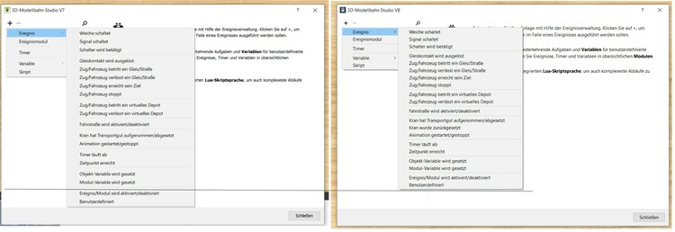 12. Hallo zusammen, hallo @Neo, bei benutzerdefinierten Ereignissen in V8, kann ich zwar Parameter eingeben, diese werden aber in der Gesamtauswahl leider nicht übernommen. Ein benutzerdefiniertes Ereignis bleibt immer parameterlos! In V7 funktioniert das problemlos. Die Auswahlbuttons "+" und "-" verdecken den Text "Name". Könnte man diese Buttons vielleicht weiter nach oben platzieren oder ganz nach links außerhalb des Rahmens? Außerdem fehlt der Abfragedialog mit "OK" und "Abbrechen", um die Gesamtauswahl zu bestätigen. Könnt ihr auch diesen Fehler reproduzieren? (getestet mit Version 8.0.11.0) Viele Grüße, Tim