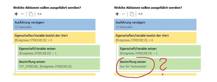 Das ist die Hauptsache. Es geschehen im Eifer des Gefechts die dümmsten Fehler, ist normal. Ich habe eine Aktionskette, die beim Betreten einer Weiche abgearbeitet wird und dieselbe sollte auch für eine andere Weiche entstehen, also habe ich das gesamte Ereignis kopiert und alle Einträge auf die andere Weiche geändert. Dachte ich! Als dann bei der zweiten Weiche immer wieder Züge zerrissen wurden habe ich eine Weile die Weichenschaltungen im Ereignisprotokoll beobachtet und dann sah ich plötzlich, dass beim Schalten der ersten Weiche die zweite auch geschaltet wurde. Nochmal genau in die Ereignisse geschaut und richtig, hatte alles geändert bis auf den Auslöser. Shit happens.
