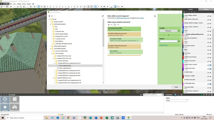 Hi Goetz Well I have taken your advice and tackled the problem with both logic and cause and effect. The net result is to at least have the barriers working fine on the close front. They also work OK on the open front although I don't seem to be able to achieve the "last train past" element for opening the barriers. Each train does this independently. My conclusion is that instead of having this instruction in the EV for each track that I somehow need to have this only once, perhaps in common instructions. My dilemma is just how to construct this so that it refers to each track. Are you able to point me in the right direction please. Cheers Pete Level crossing barriers test layout.mbp