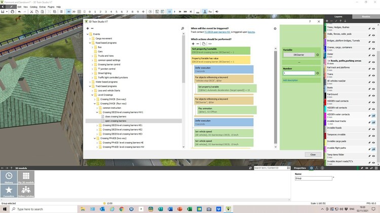 Hi Goetz Having got to grips with the basics of level crossing barrier control, thanks to your advice and example, I now have the challenge of adapting this to cope with multiple tracks. Sorting it out so that any train on any track operates the barriers and controls the vehicles was not so difficult but I now seem to be getting in a bit of a muddle trying to adjust this so that the barrier will only go up and the vehicles start to move after the last train has passed. I have taken the liberty to attach my efforts thus far which have been based on the assumption that each train would have to add '1' to the crossing barriers as they approach and a minus'1' as they leave so that when '0' is reached the barriers can go up and the vehicles start to move. Clearly I have not got this right and am not sure how to achieve this. Might I call upon your expertise for more guidance please. Kind regards Pete