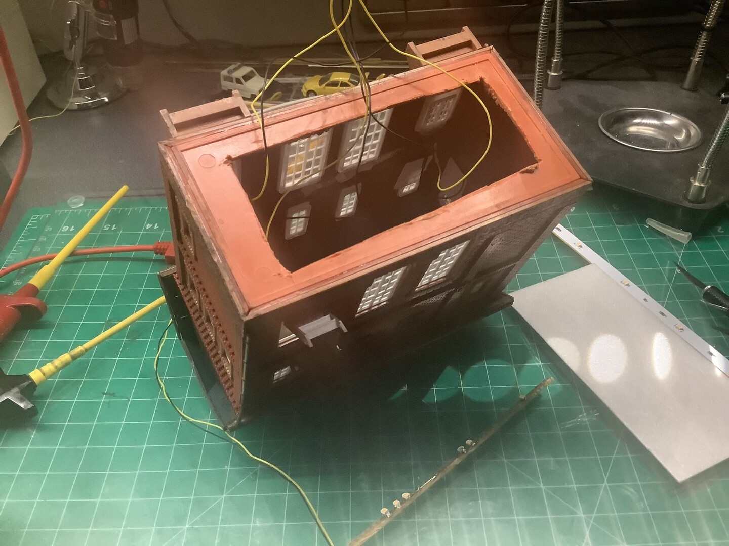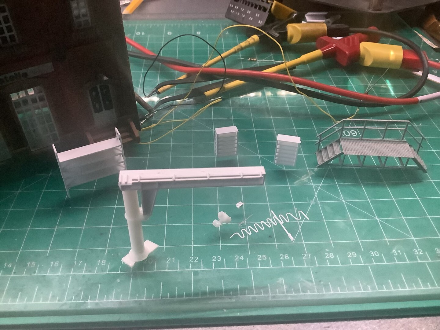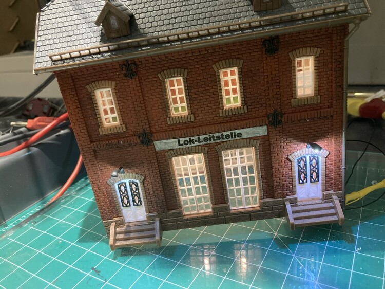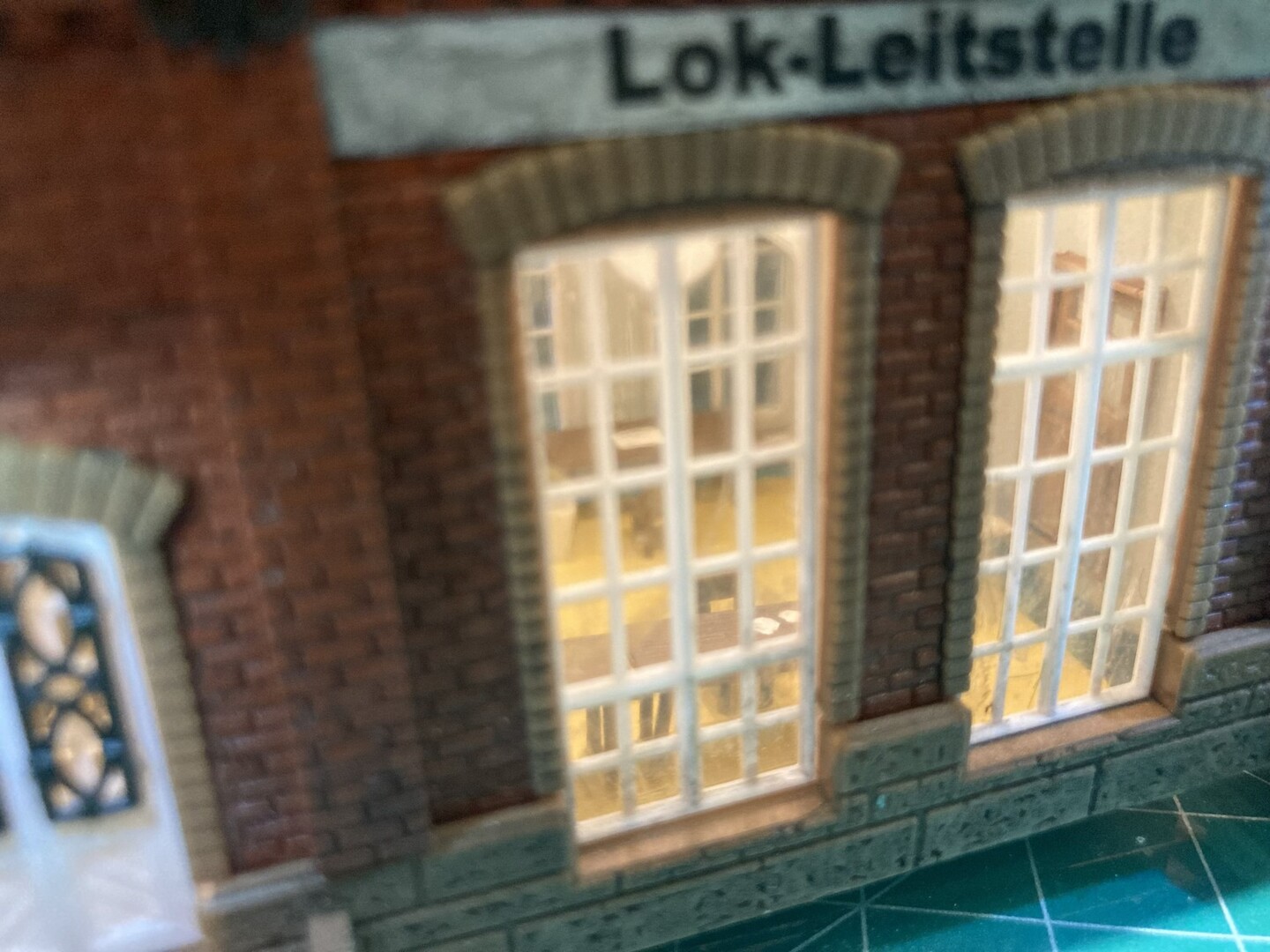 Nun geht es an die Überarbeitung des letzten BW Gebäudes, die Lokleitung. Bei näherer Betrachtung habe ich von der Inneneinrichtung des 1. OG abgesehen. Da sind die Fenster doch zu klein für den Aufwand. Das Schöne an selbstgesteckten Zielen ist ja, dass man sie jederzeit über den Haufen werfen kann, ohne jemand Anderem verantwortlich zu sein. 🤣😎😉 Die Beleuchtung allgemein und auch die Inneneinrichtung des Erdgeschosses ist aber beschlossene Sache. Die Außenleuchten waren relativ schnell angefertigt und montiert, da hatte ich ja schon Übung durch die anderen BW Gebäude. Das Licht in beiden Geschossen soll aber von der Decke kommen und gezielter als mit dem selbstklebenden LED Streifen. Dazu noch in warmweiß. Leider hatte ich keine passenden LEDs aber ein paar uralte Beleuchtungen von IKEA. Von denen hab ich die warmweißen SMD LEDs abgelötet und auf eine schmale Streifenrasterplatine übertragen. So hab ich nun erstens eine stabile Grundlage für die LEDs und zweitens gleich die elektrische Verbindung. Für die Trennung der Geschosse habe ich dann einen Boden aus 3mm Depron eingeklebt, der auf der Oberseite einen modischen grünen Bodenbelag erhalten hat. Die Unterseite bildet nun die weiße Decke des Erdgeschosses. Die Leitungen laufen an der fensterlosen Seitenwand nach unten durch die Bodenplatte. Sie werden nach Montage der Erdgeschossbeleuchtung durch eine 0,5mm ABS Platte verdeckt, die oben eine Tapete und unten ein paar Aktenschränke erhalten wird. Der Innenraum wird als Großraumbüro gestaltet mit einem Tresen, Schreibtischen, einer Plantafel und einer Treppe ins 1. OG an einer Seite. Ich habe definitiv nicht die geringste Ahnung wie es in einer Lokleitung aussah. 1970 kamen aber die ersten Großraumbüros in Mode. Evtl. trenne ich auf einer Seite auch ein kleines Treppenhaus ab. Die Toiletten befinden sich im 1.OG in dem Raum mit den Milchglasscheiben. 😉 Natürlich gerade als ich bemüht war, den Sekundenkleber an die Klebestelle und nicht an die Finger zu bekommen, klingelte natürlich der Postzusteller. Er brachte ein kleines Päckchen mit wunderschönen Kleinteilen von „Kleingedrucktes“ für die letzte Ausstattung des Lokschuppens. So etwas geht natürlich nur im Resindruck. Komplettieren des Krans und etwas Farbe, die beiliegenden Kästen in die Regale einräumen und die Innenausstattung des Schuppens ist erst mal abgeschlossen. Für die Werkstatt und die Lokleitung gibt es ebenfalls sehr schöne Ausstattungen. So habe ich für die Lokleitungen einen Kompromiss gefunden, bei dem Aufwand und Ergebnis in einem vernünftigen Verhältnis steht. Beste Grüße, Ralf