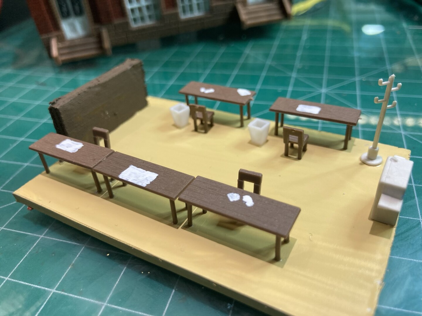 Die Lokleitung ist bereit wieder auf die Anlage zu kommen. Bei der Inneneinrichtung habe ich mich auf das Erdgeschoss beschränkt. Die Fenster im 1.OG sind meiner Meinung nach zu klein. LOL…und auf meiner Anlage zählt meine Meinung…..acting God in my own Universe….🤣😎😉Wenn ein Preiserlein ermordet werden soll, dann liegt er halt in einer Blutlache…🙀🥴😎 Mh…überlegenswerte kleine Szene…makaber aber Platz für Einsatzfahrzeuge, Polizisten und vieles mehr…zwar nicht aus meinem Leben, halt aus dem Leben allgemein. Zurück zum Thema…Ich hatte bei [URL=https://www.kleingedrucktes-h0.de/]Kleingedrucktes-h0[/URL] schon einen Warenkorb gefüllt mit Büroeinrichtung und noch ein paar Maschinen für die Werkstatt, bei näherer Betrachtung habe ich aber beschlossen, meine Restekisten zu durchforsten, wo ich ein paar Tische und Stühle gefunden hab. Das ist das Ergebnis. Vorn ein Tresen, wo die Lokführer ihre Fahraufträge entgegennehmen können, hinten 2 weitere Arbeitsplatze. Ein Aktenschrank aus einem Stück Holzleiste, dazu 2 Papierkörbe, ein Kleiderständer und das Highlight ein Großkopierer, der bei irgend einem Gebäudebausatz übrig war. Sehr einfach aber es erfüllt absolut seinen Zweck. Im Gebäude kann man bei eingeschalteter Beleuchtung gerade eben die Objekte schemenhaft erkennen. Die Wände habe ich von innen mit einem sehr hellen Graublau gemalt. In erster Linie um die Reflektion der LEDs zu verbessern. Der Raum hat natürlich auch eine braune Zimmertür bekommen. Von Nahem kann man gerade eben erkennen, dass überhaupt eine Inneneinrichtung vorhanden ist. Genaueres, wie Telefone oder Schreibmaschinen auf den Tischen wäre Geldverschwendung gewesen. Beste Grüße, Ralf