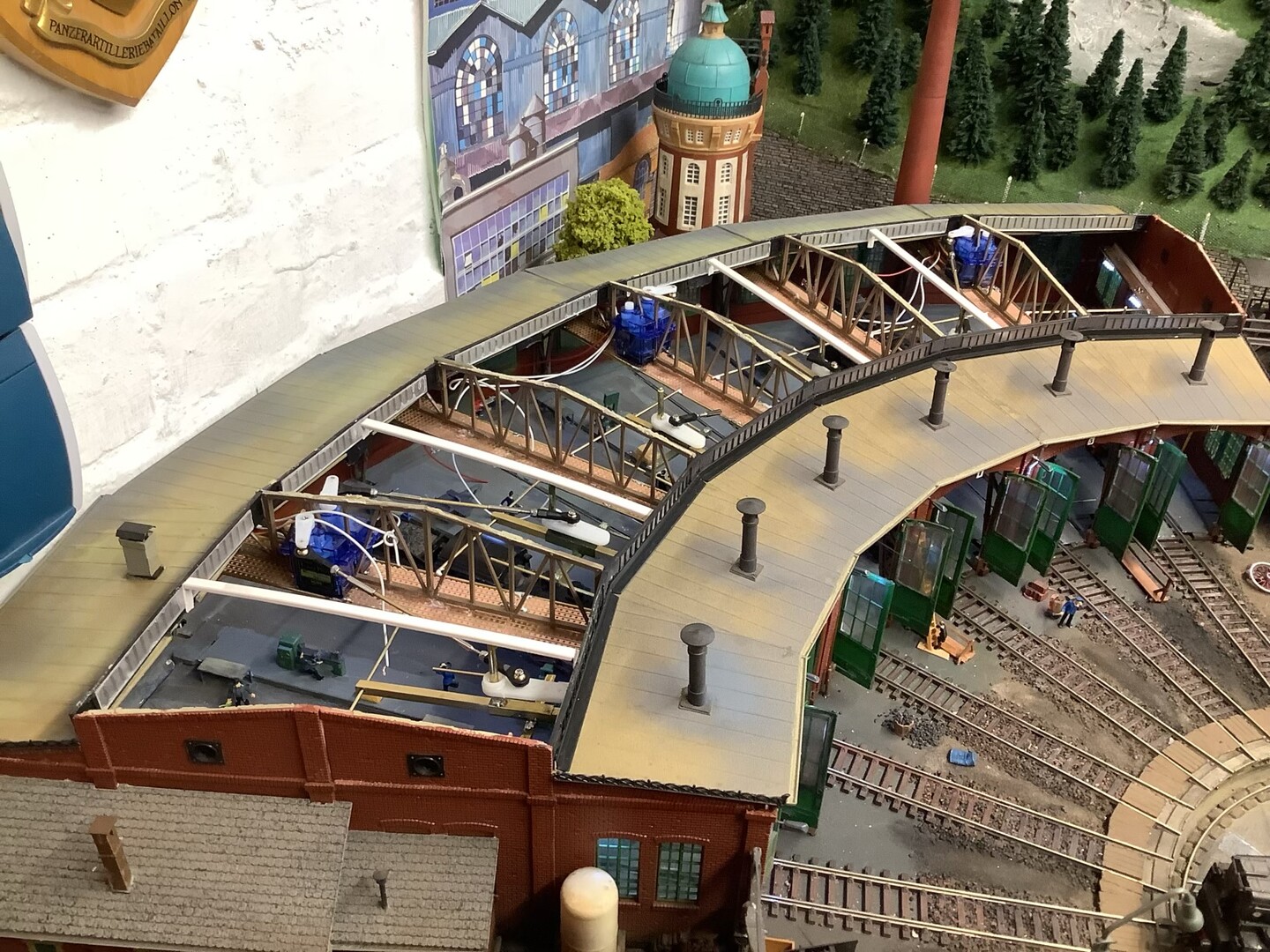 Es geht weiter. Das Schuppendach ist nun komplett entfernt…wieso eigentlich Schuppen? Im Englischen ist es wenigstens ein Haus..🤣 Die Schuppengleise wurden gerade ausgerichtet. Schuppen und Gleise passten nicht 100% übereinander, ich hatte zuerst die Gleise verlegt und dann den Schuppen darüber gesetzt. Nun liegen die Gleise genau mittig in jedem Stand. So konnte ich die seitlichen ABS Segmente mit gleichem Maß zuschneiden. Diese Segmente sind verspachtelt und in den ersten beiden Ständen ist auch schon die erste Grundierung für den Betonboden aufgetragen. Die Verkabelung habe ich angepasst, so wird die Stromzufuhr zu den Schuppengleisen nicht mehr durch die Bühne bestimmt, sondern später durch die Öffnung der Tore. Da der Schuppen eine Inneneinrichtung erhalten soll kam für mich die Anordnung der Servos innerhalb des Schuppens nicht in Frage. Die Drehachse der Tore unter die Platte zu verlängern ist aber nahezu unmöglich. Es wird also auf Stelldrähte an den ursprünglichen Anlenkpunkten hinauslaufen, allerdings dann mit einer Drehachse am Ende des Schuppengleises. Ein bemaltes Messingröhrchen mit drehbarer Welle darin erscheint mir wesentlich unauffälliger als ein hinten unter der Decke platziertes Servo. Für die Einrichtung sind ein paar Werkbänke schon fertig, ebenso die 28 Leuchtstoffleuchten, bestehend aus jeweils 4 LEDs. Dass da noch ein Einschalteffekt dazu kommt glaube ich nicht. Bis auf ein paar Effekte hab ich ja eh eine Oldschool Ein-Aus Beleuchtung. Die Werkzeugmaschinen werden wohl noch diese Woche eintrudeln, ebenso die Streifenrasterplatinen, die unterhalb der Fetten die Basis für Beleuchtung und Antriebsmechaniken bilden werden. Bis das soweit ist bleibt mir noch Zeit den Boden zu vervollständigen und die Oberkante der Fetten von Kleberrestenn zu befreien. Und natürlich noch diverse Arbeiter einzukleiden. Auf Untersuchungsgruben innerhalb des Schuppens hab ich verzichtet. Meine Mini-Stichsäge hätte zwar in den Schuppen gepasst, aber irgendwann wird die Anlage ja eh wieder abgerissen, aber darauf will ich momentan nicht zu viele Gedanken verschwenden. Beste Grüße, Ralf