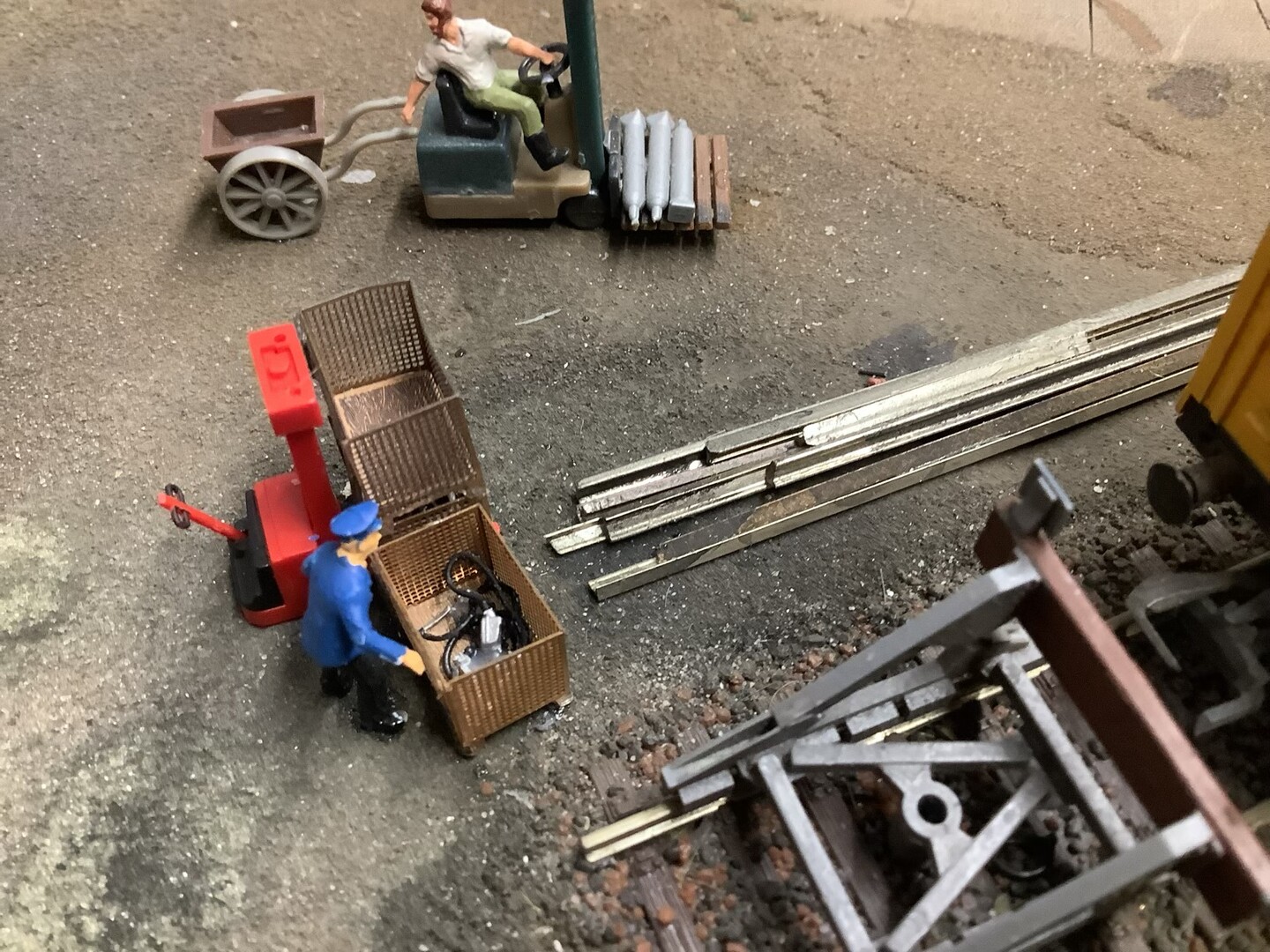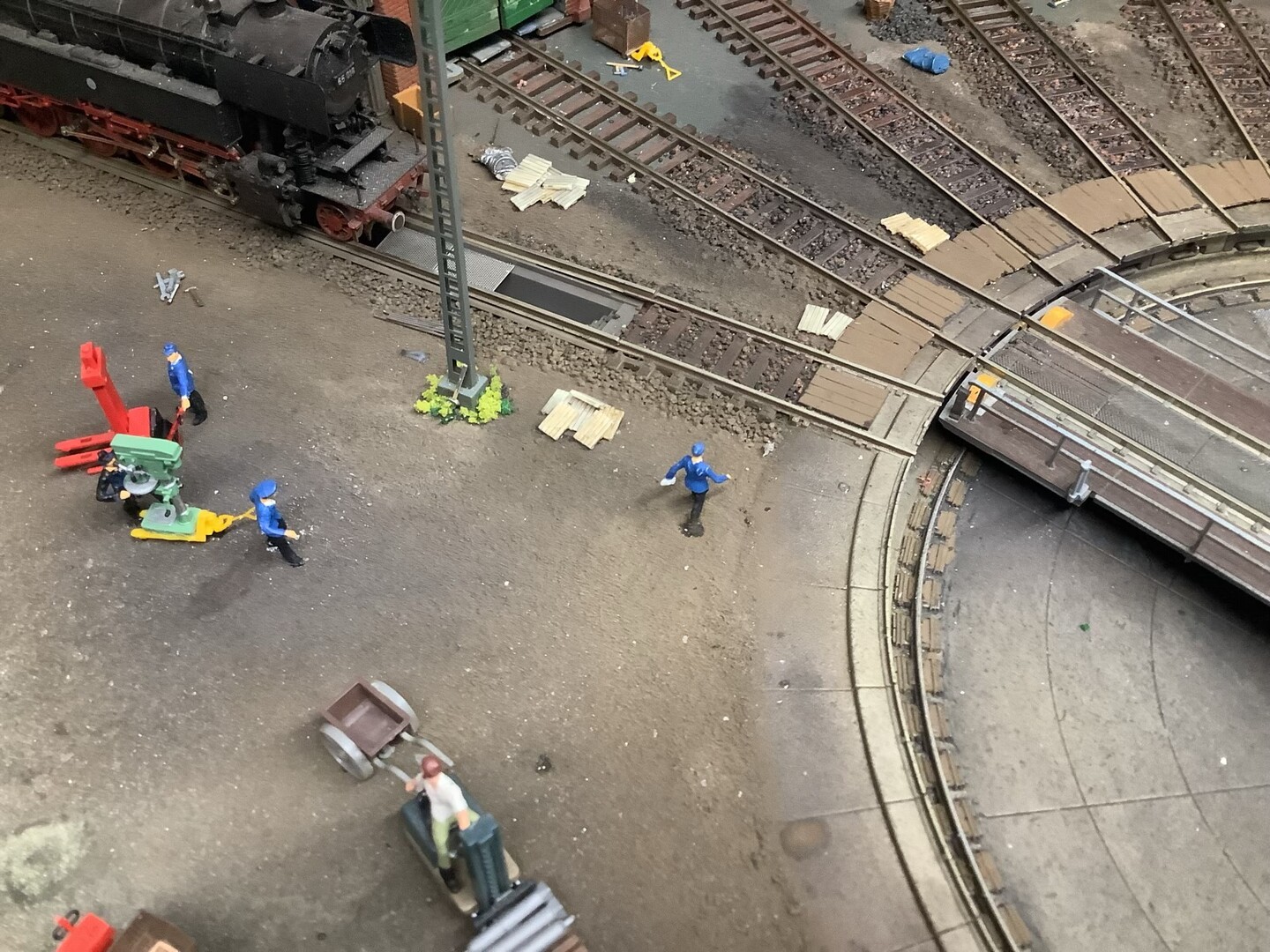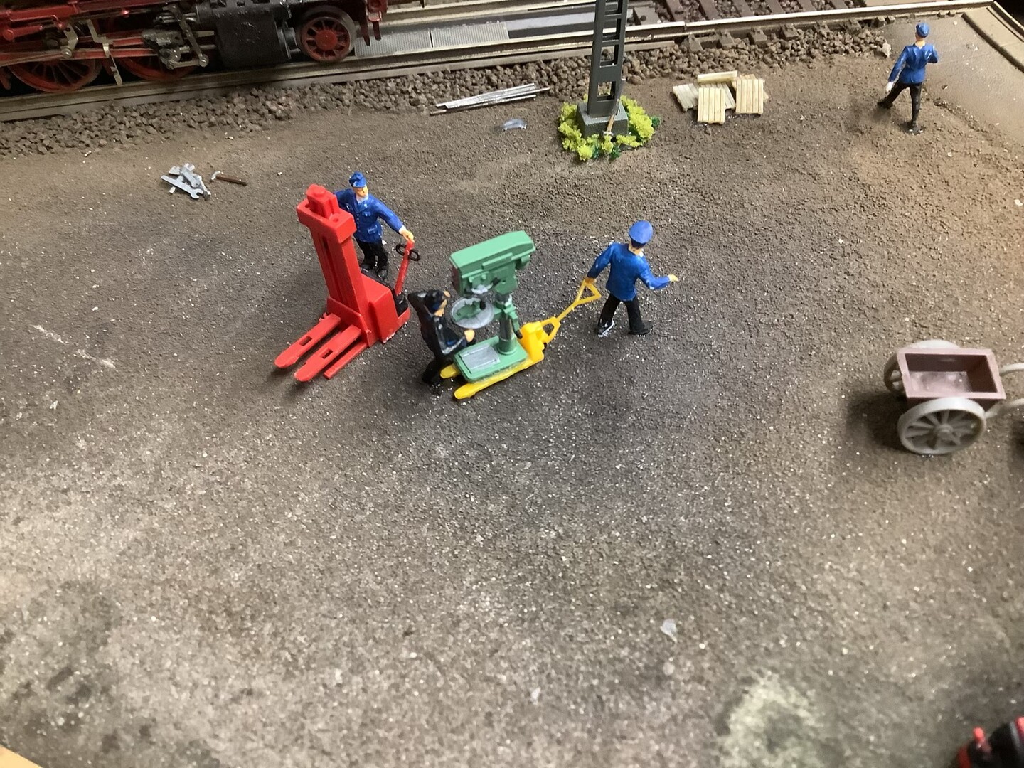 Nachdem nun alle 12 Torflügel sauber auf- und zufahren ( die Zeitversetzung ist noch in Arbeit ), habe ich ein wenig in die weitere Ausstatttung des BW gesteckt. Die Werkstatt bekommt eine neue Standbohrmaschine, sie ist gerade geliefert worden. Den LKW des Lieferanten suche ich noch. Einen Kofferaufbau mit verstellbarer Ladebordwand, also auch im bodennahen Zustand darstellbar, habe ich bereits gefunden. Es fehlt noch das Fahrgestell, das vom Baujahr dicht am Darstellungsjahr der Anlage liegen sollte. Je älter, um so unwahrscheinlicher ist das Vorhandensein einer Ladebordwand. Sollte ich aber bei der Suche auf einen LKW mit Ladekran stoßen, so wäre der eine Alternative. Ansonsten sind einige Arbeiter schon mit dem Transport der Maschine in Richtung Werkstatt beschäftigt. Karl zieht kräftig, während Heinrich eher das Kippen der Maschine zu verhindern trachtet. Die Ameise hat schon ausgedient und kann zurück in den Schuppen. Insgesamt sind die neuen Flurförderfahrzeuge schon eine große Hilfe bei allen Transporten. Jochen bemannt gerade seinen Stapler um Bretter heranzukarren. Die sind auch dringend nötig, damit Unebenheiten auf dem Transportweg ausgeglichen werden können. Ein paar stabile Paletten liegen dafür auch schon bereit. Rechts im Stand 5 kann man gerade noch die Platte der ebenfalls neuen Werkbank erkennen. Mit Schubladen-Unterschrank und Schraubstock. Sebastian sucht immer noch nach dem passenden Bremsschlauch. Eine Ameise um die oben stehende Gitterbox anzuheben hat er vorsichtshalber schon mitgebracht. Beim letzten Foto fällt mir auf, dass ich eigentlich die völlig unnütze Befestigung des Prellbockes mit einem meiner neuen Werkzeuge heraustrennen kann. Falls es mit dem Skalpell nicht klappt, dann auf jeden Fall mit der neuen Rasierblattsäge. Die ist Voraussetzung für die Umbauten an ein paar Autos, die ich vorhabe. ( Bus mit geöffneter Tür und Passagieren beim Einsteigen ). Zum Heraustrennen der Türen sollte das Blatt der Säge möglichst schmal sein. Auf ein Video der Torantriebe hab ich vorerst verzichtet, bis ich die Zeitverzögerung realisiert hab. Allein durch die Reibung des Schiebers an den Stellstangen ergeben sich manchmal unterschiedliche Öffnungen der beiden Flügel. Das ist aber rein zufällig…..auch ein recht interessanter Effekt…..vielleicht lasse ich es auch so…Es sieht jedenfalls nicht sonderlich einprogrammiert aus, öffnet und schließt die Tore aber dennoch zuverlässig und in angenehmer Geschwindigkeit. Beste Grüße, Ralf P.s. Die Idee der Transportszene kam mir als ich das Modell der neuen Bohrmaschine ausgepackt hatte. Die ist so fein detailliert, dass sie auf keinen Fall im Schuppen untergehen durfte. Aber eine Maschine vor der Tür? Ja, genau in der Zeit, wo sie an ihren späteren Standort verbracht wird.