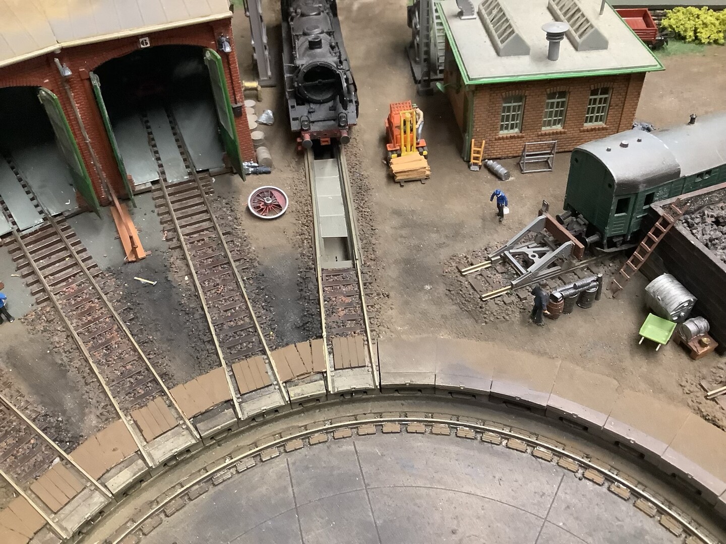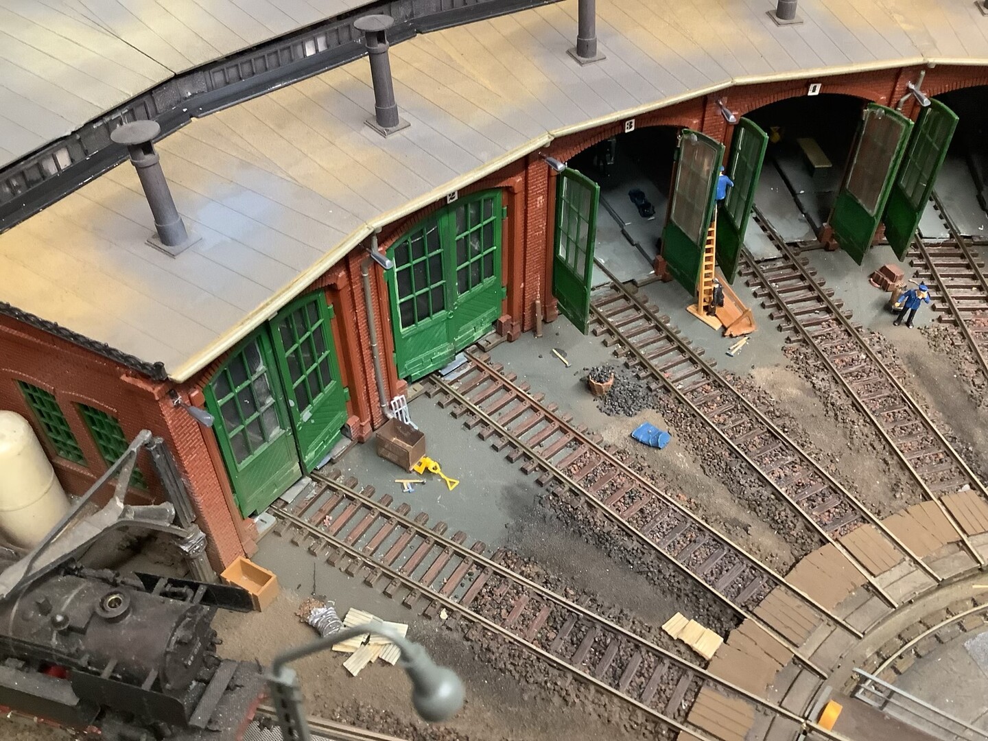 So, noch mal kurz im Keller gewesen und Fotos gemacht. Dabei hab ich gleich den Lokschuppen abgedeckt. Da haben zwei doch ein ruhiges Plätzchen gefunden. Auf, vor und neben der Bühne sind ein paar Details hinzugekommen. Das neue „alte“ Stellwerk des BW. Mit Trampelpfad zum Nebeneingang. Die Grube der Drehscheibe nach der Alterung. Der Lokschuppen jetzt teilweise schon abgedeckt. Bislang ist es ohne Beschädigungen der Wände abgelaufen. Ich muss allerdings die Fenster nachbehandeln. Nach Jahren ist der Kleber nun schneeweiß und die Scheiben wohl nicht zu ersetzen, ohne die Rahmen zu zerstören. Selbst mit der neuen Beleuchtung und geöffneten Toren ohne Lokomotiven im Schuppen wird man wohl nur ansatzweise einen Blick auf die Rückwände haben. Daher wird es wohl auf ein Kaschieren der weißen Stellen hinauslaufen. Wenn ich mir den Luxus erlaube und die hinteren Bereiche des Schuppens mit Gerätschaften zu versehen werde ich um eine Unterflurmontage der Servos nicht herumkommen. Die Montage innerhalb des Schuppens wäre deutlich mehr zu sehen als der Kleber an den Fenstern. Mal sehen, was mir da so einfällt. Für jedes Problem gibt es ja irgend eine Lösung. Die kleinen Leuchten neben den Toren werden auf jeden Fall beim Beleuchtungsumbau eine LED verpasst bekommen. Beste Grüße, Ralf