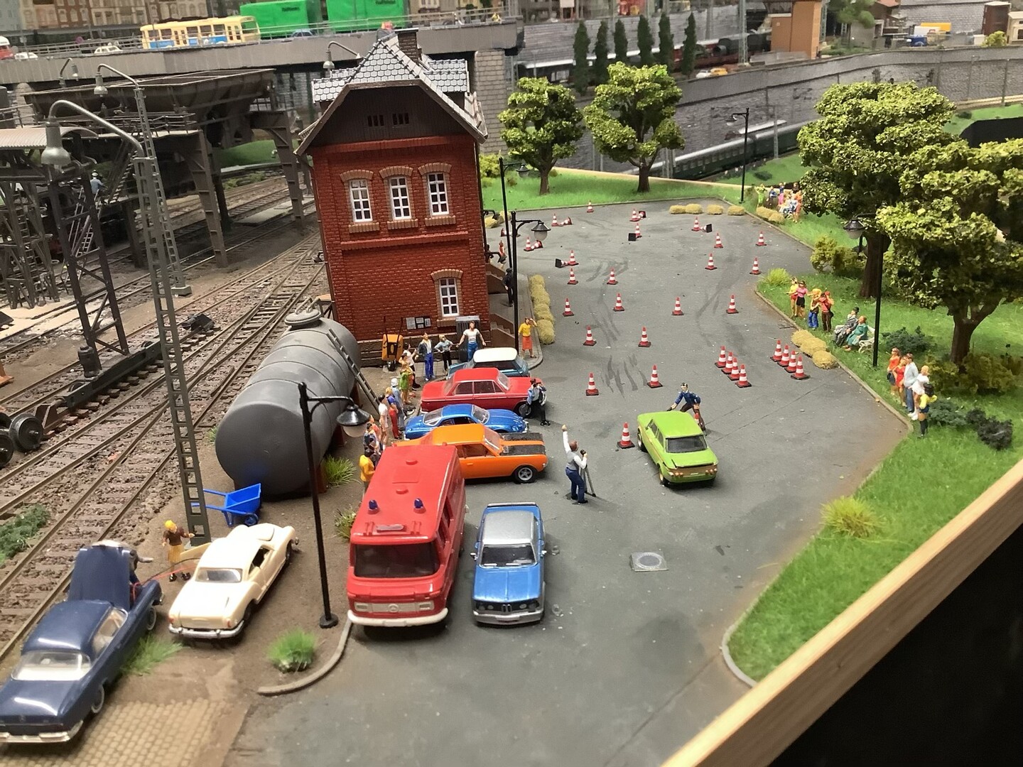 Nun geht das Jahr mit all seinen Höhen und Tiefen endgültig seinem Ende entgegen. Ein letzter Besuch im Keller für dieses Jahr mit wenigen kleinen unwichtigen, aber auch für mich wichtigen Veränderungen. Wichtig für mich ist es, mich nicht mehr über Kleinigkeiten aufregen zu müssen. Vor ca. 6 Monaten habe ich das Spiralkabel meine Lenz Handreglers durch ein längeres ersetzt. Schon nach 3 Tagen zog sich das Kabel nicht mehr wirklich zusammen. Das habe ich gestern in die Tonne getreten und durch ein Kabel eines deutschen Telefonherstellers ersetzt. Eine völlig andere Hausnummer, allerdings bei gleicher Länge nahezu doppelt so schwer. Das sind aber halt Dinge, wo in meinen Augen die Funktion einfach gegeben sein muss, schlechte Qualität nervt mich halt einfach. Ansonsten gab es in der letzten Jahreswoche nur eine optische Ergänzung des BW. Ein Dank nochmal an Olli, der mich animierte nochmal Fotos von Bereichen vor Ringlokschuppen anzuschauen. So sind die Schuppengleise nun bis an die Tore heran eingeschottert. Wie alle Gleise im BW natürlich ohne Bahndamm. Schön schmutzig sehen sie auch schon aus. In mühevoller Kleinarbeit hat sich die Zuschauerzahl beim Automobilslalom auf dem Parkplatz des BW mehr als verdoppelt. Hier schwächelt der Bezug zur Wirklichkeit allerdings ein wenig. Komischerweise sind die meisten Zuschauer weiblich. 🤣😎 Ein paar unbemalte Herren sind allerdings noch in Arbeit. Dazu kommen auch noch die beiden Sanitäter aus dem Rettungswagen. Feuerwehrleute hab ich noch etliche im Karton aber wie die Sanitäteruniform der Feuerwehr um 1970 aussah muss ich erst noch herausfinden. Bei Preiser im Katalog hab ich da noch nichts gesehen. Mal sehen wie es im nächsten Jahr weitergeht. Im Januar soll jedenfalls das BW zum Abschluss kommen inkl. Wendeschleifenmodul und LKW mit Ladebordwand, offener Fahrertür und hochkletterndem Fahrer. Und natürlich die Arbeitsbühnen im Schuppen. Dann richtet sich das Hauptaugenmerk auf den Staatsbesuch von Franz Joseph Strauss mit den Demonstranten und der Presse beim kleinen Schmalspur-Bergbahnhof und die Nebenbahn an der hinteren Anlagenkante. Da fehlt noch ein unbeschrankter Bahnübergang und dann wird auch die große Stadtplatte ihren Weg zurück in den Keller antreten. Vorher wird noch die IR Überwachung des Schattenbahnhofs abgeschlossen werden. Die funktioniert in eine Richtung schon prima und störungsfrei. Nun bleibt mir abschließend allen Forumsmitgliedern ein frohes, glückliches und vor Allem gesundes neues Jahr zu wünschen. Mögen im Jahr 2026 all Eure Wünsche in Erfüllung gehen. 🎉🎊🎇🎆🥂🥳 Beste Grüße, Ralf