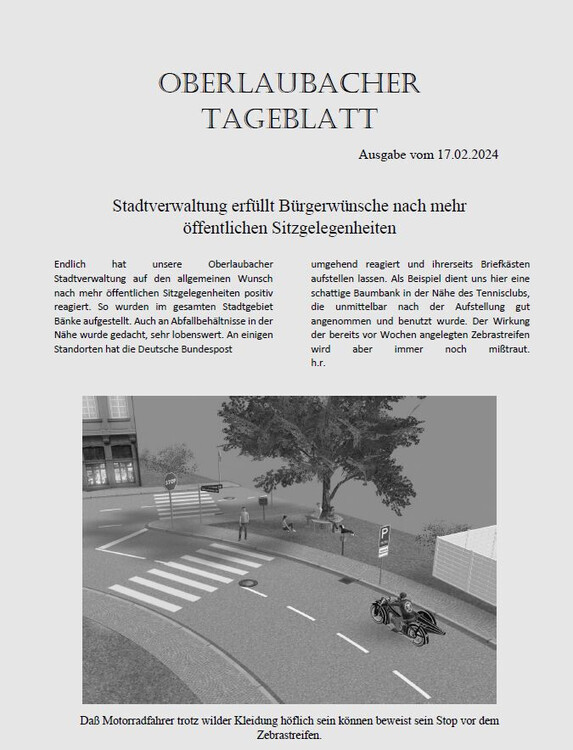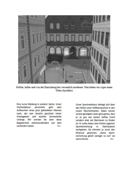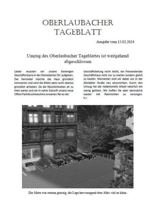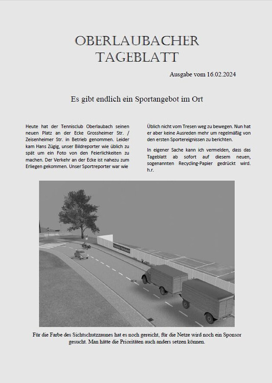 Ich freue mich, vom Chefredakteur des Oberlaubacher Tageblattes die Genemigung zum Abdruck erhalten zu haben. Ich habe gehört, dass nächste Woche dort auch ein Lektor eingestellt wird. Die Rechtschreibfehler von Herberth Ramsauer sollten dann auch weniger werden. Jetzt, da in der Anlage die ersten Objekte eingefügt sind, die die Platte überragen habe ich auf eine Bildgestaltung des Hintergrundes verzichtet. Den muss ich individuell erstellen, damit er passt. Die Anlage ist halt aus einer imaginären Landschaft herausgestanzt. Beste Grüße, Ralf