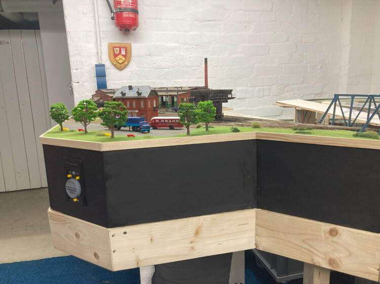 Heute hab ich im Keller noch eine Flasche Vollton und Abtönfarbe gefunden, in "Nachtschwarz". Vieles was ich finde wird sofort verarbeitet. Hier das Ergebnis: Schöner Kontrast zum Naturholz der Unterkonstruktion und der Anlagenkante. (find ich zumindest, ist aber subjektiv. Und Sperrhilzreste hab ich auch noch gefunden. Mit einer geraden Kante ideal für den vorderen Abschluß. Die Farbunterschiede werden hinter dem Schwarz nachher nicht mehr zu sehen sein. Fliegendraht ist auch beschafft ebenso wie Gips. Auch den kann man schön mit Pigmenten mischen. Die Pülverchen sind einfach klasse. Ich muß nur aufpassen, dass ich die Bereiche die momentan noch zum Einstieg geeignet sind nicht vor lauter Schaffensdrang zubaue. Die sollen als letztes dran sein und es gibt sie noch, Gott sei Dank ;-) Die MBS-Anlage geht bei der Ausschmückung auch voran. Zum WE werde ich die Reklametafeln mal wieder löschen und die neueste Version dann mal wieder hochladen. Beste Grüße, Ralf- LEGO Anlage mit dem MBS