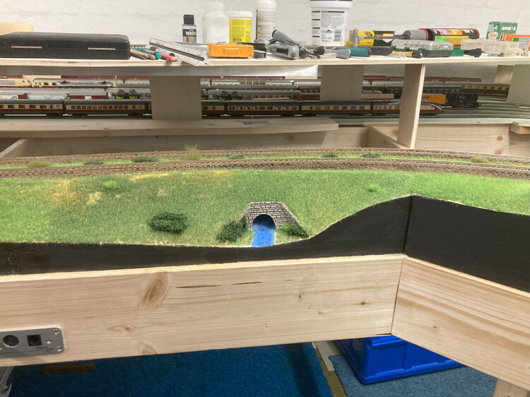 Momentan hab ich viel zu tun und komm kaum zum Basteln. Das ist auch auf der Realanlage derzeit mein Projekt. Allerdings an etwas andere Stelle. Rebstöcke belauben ist eine recht öde Arbeit, besonders wenn es recht viele werden. Die ersten 40 sind aber fertig, 20 davon bereits auf der Anlage. Es ist noch immer recht viel Hügel übrig. Aber auch die Gleisharfe Ost des Schattenbahnhofs ist nun vollendet. Es wird langsam. Beste Grüße, Ralf