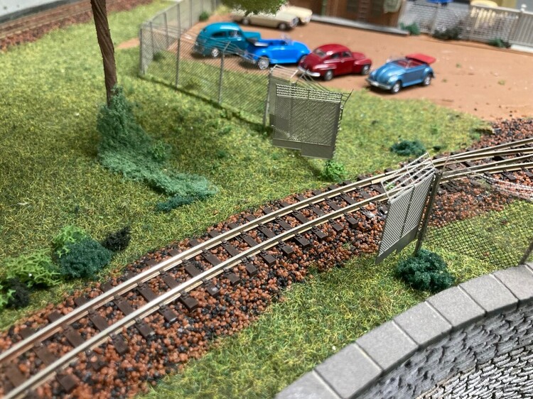 Noch fehlt ein kleines Lautsprecherkabel und ein Servo für die Schranke. In der Zwischenzeit habe ich mich mit der Sicherheit des Bahnhofes beschäftigt. Hier hat jetzt zwischen dem kleinen Industriegebiet und dem Bahnhofsgelände ein Maschendrahtzaun seinen Platz gefunden. Der aufgesetzte Stacheldraht sollte ein Überklettern vermeiden. Graffiti Sprayer waren um diese Zeit ja noch Utopie. Das passende Tor für den Durchlass der Schmalspurstrecke ist bestellt und so wird dieser Bereich demnächst auch abgeschlossen. Die Tankstelle hat ein paar Angestellte und einen Chef bekommen. Bislang hat sich aber niemand von ihnen im Einwohnermeldeamt blicken lassen. So kann ich noch keine Angaben über die Namen machen. Es ist aber schon eine schriftliche Aufforderung ergangen, auch wegen Gewerbeschein, Steueranmeldung usw..🥴 Ich habe beschlossen, die Weiche vor dem Sägewerk als Dummy einzubauen, mit feststehenden Weichenzungen. Es wird eh nie ein Zug auf das Kunststoffgleis des Sägewerkes fahren, das würde höchstens eine Rettungsaktion verursachen, die ich mir durch die „Nichtbefahrbarkeit“ erspare. Sehen kann man die Tore des Sägewerkes eh nicht. Von der Schranke sieht man wenigstens die farblich gut zu erkennenden Enden der Schrankenbäume wenn die Schranke offen ist, man hört das Läutewerk und sieht den Widerschein der Blinklichter. Dass da wirklich Andreaskreuze stehen weiß ich, sehen kann man sie höchstens mit einem Selfiestick. 🤣 aber so sind ja viele Details der Anlage vor allzu neugierigen Blicken verborgen. Neueste Installation ist eine PTZ Kamera, mit der ich die Anlage vom Büro aus beobachten kann. Die erfüllt mehrere Aufgaben. Primär tatsächlich um zu beobachten, wie sich die Programmierungen vom Büro aus auf die Anlage auswirken, ohne dafür extra in den Keller zu müssen. Sekundär als Sicherheit für meine Freundin, da die Kamera Bewegungen nach oben übermittelt. Solange sie Meldungen bekommt, weiß sie zumindest, dass ich noch lebe. 😎😁🙀 Meist bin ich ja allein im Keller. Beste Grüße, Ralf