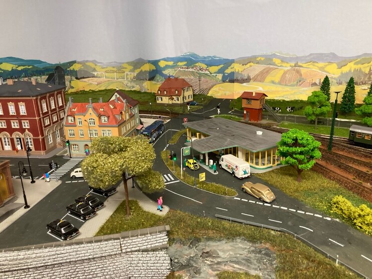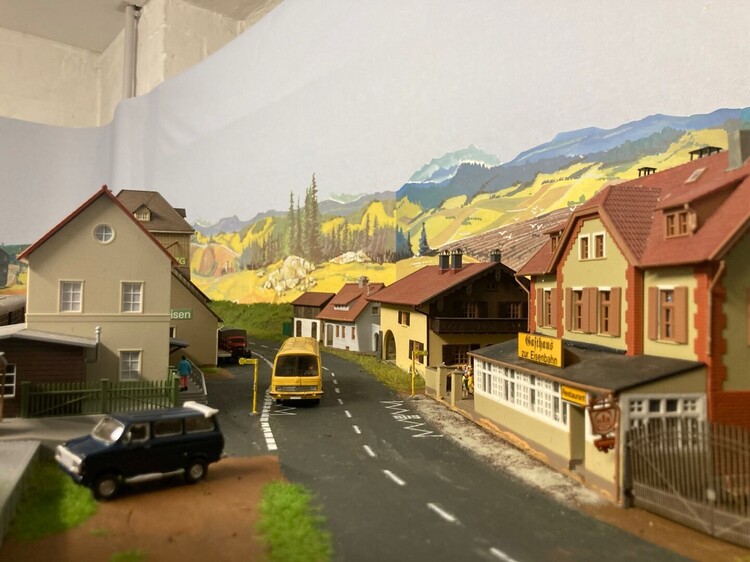 Mal wieder ein kleines Update. Die östliche Anlagenkante geht ihrer Vollendung entgegen. Im Gasthaus zur Eisenbahn spielt die örtliche Blaskapelle auf. Da wird wohl dann das zweite MP3-Modul nach dem Tanzcafe montiert werden. Die Verkehrsschilder stehen auch schon und ein paar Zäune sind auch errichtet. Da ich noch einige Schwarzgefleckte in meinem Fundus hatte, umschließt einer der Zäune eine Weide, die anderen dienen der Absicherung der Bahnanlagen. Ein paar Bäume sind in Fernost bestellt und werden das Bild am Rand nach Osten abschließen. Das Soundmodul, die Bäume, Sträucher, Begrenzungspfähle, weitere Fahrzeuge und Einwohner werden diesen, größtenteils unsichtbaren Teil abschließen. Für den Bahnhofsbereich weiter vorn sind heute die Leuchten für die Bahnsteige und das Vorfeld eingetroffen, so dass am kommenden WE genug zu tun bleibt. Leider gibt es natürlich auch Rückschläge. So hat sich eine Lötstelle für die Digitalspannung der Schmalspurstrecke im Westen als kalte Lötstelle entpuppt, natürlich an einer recht schwierig erreichbaren Stelle. 🥺 Ich komme zwar mit dem Lötkolben dran, konnte aber bislang nicht sehen, was ich da überhaupt mache. Dafür ist aber heute auch ein Taschenspiegel angekommen. So werde ich am WE auch dieses Problem gelöst haben. Auch die Familie der Käfer wächst. Stand heute sind es bislang 17 Mitglieder. Um aber die Zeit 69/70 darzustellen möchte ich einen wirklichen Überschuss der Krabbeltiere auf den Straßen haben. Ziel sind hier mindestens 40 Exemplare. 🙀 Beste Grüße, Ralf p.s. Ich habe mir auch eine 100er Packung stehende Personen aus Fernost gekauft. Nach der Lieferung von sitzenden Personen im letzten Jahr, die wirklich sehr schlecht bemalt waren, besser gesagt in unterschiedliche Farben getaucht, war ich angenehm überrascht. Die Sitzenden sieht man in den Waggons und Autos eh kaum, daher zu verkraften, die neuen Einwohner haben nur 2 Nachteile: Erstens haben sie einen fürchterlichen Modegeschmack zu schreienden Farben und zweitens scheinen Alle auf Lack und Leder zu stehen und noch dazu viel Haargel zu benutzen. Die Bemalung ist für den Preis wirklich Spitze, sogar mit Krawatten und Gürteln, leider aber mit glänzenden Lacken. Im Hintergrund und später unter dem Dach der Bahnhofshalle wird es schon gehen. Ich werde mal versuchen mit mattem Klarlack den Glanz zu reduzieren.