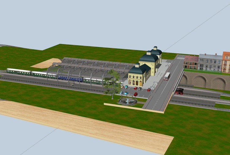 Insgesamt eine recht gebirgige Landschaft mit einer Kleinstadt wo die Bahngleise unter dem eigentlichen Stadtniveau liegen. Das Empangsgebäude ist quer über die Gleise gebaut und soll noch durch einen Mittelpfeiler swischen den Gleisen 2 und 3 abgestützt werden. Für die Fussgänger sind noch Zebrastreifen vor dem Bahnhof anzulegen. Die Absturzsicherungen sind auch noch suboptimal. Beim realen Bau kommt wieder der verkürzte Bahnhof Baden-Baden zum Einsatz, ebenso die modifizierte Bahnhofshalle von Faller. Vom ursprünglichen Bahnsteig des Bahnhofs führen dann Treppen zu den Bahnsteigen hinunter, da muss ich noch mal schauen wie ich das hier realisieren kann. Die vorhandenen Übergänge im Online-Katalog sind da zu kurz.