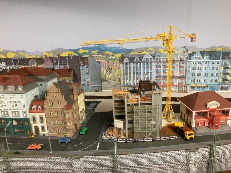 Andere Preiserlein habe ich nun etwas unter Druck gesetzt. Hatten die Bauarbeiter am neuen Geschäfts- und Wohnhaus (mit Arztpraxen) einen recht ruhigen Job, so ist es mit der Ruhe nun vorbei. Der Turmdrehkran wurde aufgestellt und nun wird Baumaterial zügig bis in die oberste fertiggestellte Etage geliefert. So wird die Arbeitsgeschwindigkeit erheblich gesteigert aber wie es halt bei Modellbahnen ist: Fertig wird der Bau nie. 🤣😎 Die Hintergründe wurden ebenfalls erweitert, ich habe tatsächlich einige Stadtmotive der alten Anlage nach Einweichen vorsichtig von der Wand lösen können. Man spart halt wo man kann. 🤣🥴 Beste Grüße, Ralf