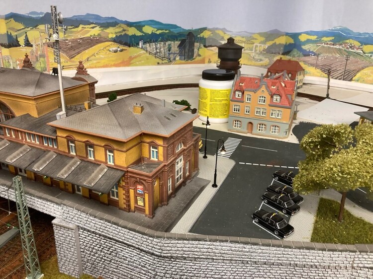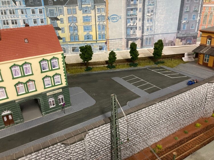 Langsam aber kontinuierlich geht es weiter. Derzeit ist die Stadt rund um das Bahnhofsgebäude dran. Eine großzügige Freitreppe wurde angelegt um den Höhenunterschied zwischen Gebäude und Gehweg auszugleichen. Bei dieser Gelegenheit wurde der öffentliche Parkplatz asphaltiert und die Straßenmarkierungen aufgebracht. Die Gehwege in diesem Bereich wurden bis auf die Bordsteine auch fertiggestellt. Das letzte komplette Haus westlich des Bahnhofsgebäudes wurde auch errichtet. Hier hat Modellbau Fritz sein Domizil bezogen. Modellbahnen gehören auch zu seinem Lieferprogramm. Der innerstädtische Bahndamm wurde durch einen Zaun aus Schienenresten und 0,5mm Stahldraht abgesichert und auch ein paar Bäume, die unerwartet aus Restmaterialien großgezogen werden konnten wurden gepflanzt. Die Oberlaubacher Stadtverwaltung, die nebenbei noch in einem Wohnwagen am Badesee untergekommen ist, ein Rathaus ist ja erst in Planung, hat aber beschlossen, um die Finanzierung desselben zu beschleunigen, auf dem Parkplatz Parkuhren aufzustellen, da diese noch im Städtischen Magazin vorhanden sind. Der Parkplatz auf der anderen Seite des Bahnhofsgebäudes ist mittlerweile durch ein Schild nur für Taxen ausgewiesen. Wichtiger ist aber, dass die Beleuchtung des Bahnhofsvorplatzes installiert wurde. An diese vielbefahrene Einmündung wird im Laufe dieser Woche noch die einzige Ampelanlage im modellbautechnisch angelegten Teil von Oberlaubach installiert werden. Aus Richtung Bahnhof werden dafür 2 Ampeln hintereinander aufgebaut, da die Zufahrt zum Taxistand zwischen Zebrastreifen und Einmündung liegt. Der unbeschrankte Bahnübergang in Richtung Stuttgart gehört ebenfalls zu diesem Baulos. Abseits der großen Herseller gibt es doch immer wieder kleinere Firmen, die preislich erheblich günstiger sind. Bei LED-Shop.com habe ich die gesamte Ampelanlage inkl. Fußgängerampeln und Steuerung für unter 100 € gefunden. Die Detaillierung erscheint mir für den Standort, der nicht gerade am vorderen Anlagenrand liegt, als völlig ausreichend. Auf deren Seite gibt es nebenbei auch sehr gute und hilfreiche Tipps für LEDs. Berechnung der Vorwiderstände ist nur einer davon. Beste Grüße, Ralf p.s. Warum komplettes Gebäude? Es werden hinter dem Bahndamm wie auch weiter westlich noch einige Halbreliefhäuser hinzukommen.