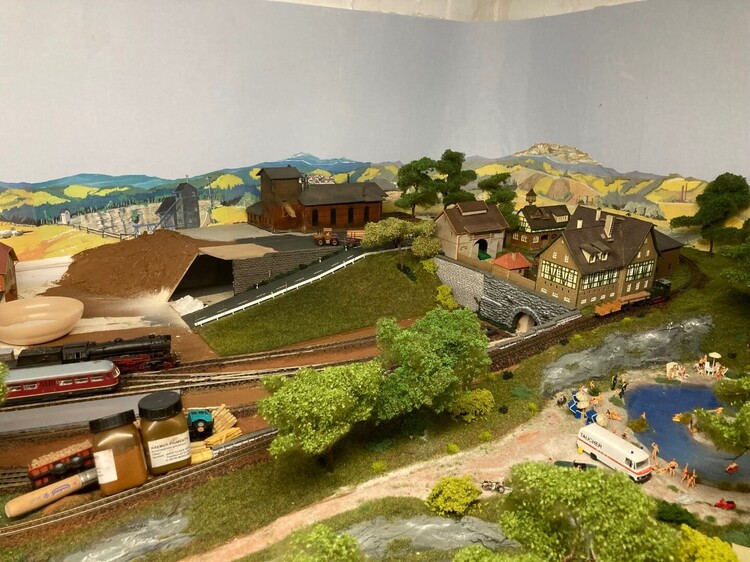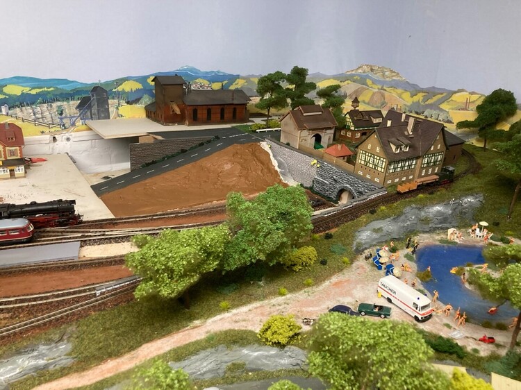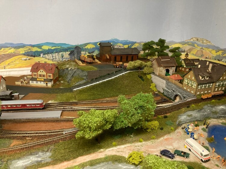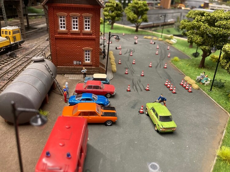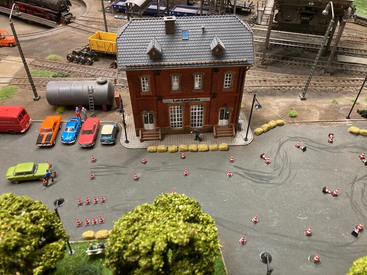Schön mal wieder ein Stückchen Modellbahn ohne Krabbeln und Kopfstoßen zu bearbeiten. 🤣 Sonntags, nett an der Hausbar mit Blick auf das Hamburger Schietwetter und freiem Zugang von allen Seiten macht es gleich doppelt Spaß. So läßt aber auch die Detailierung im hinteren Anlagenteil nicht nach. Die Schilder sind gesetzt, das Gras gewachsen, noch dazu schön ungleichmäßig und die ersten Ausstattungteile hinzugefügt. Der Untergrund etwas schattiert und die unterschiedlichen Grasfasern im Begrasungsgerät nur grob durchgemischt ergeben diesen Effekt. Durch den das komplette Fliegengitter als Gegenpol stehen die Fasern wie eine Eins. Die Mauer benötigt noch einen Abschluss und wohl auch einen Sicherheitszaun….oder auch nicht. 69/70 wurde ja noch nicht jede kleine Gefahrenquelle abgesichert. Da zählte der gesunde Menschenverstand noch mehr als heute. Daher hab ich auch auf die mauerseitige Leitplanke verzichtet. Hier kann man auch gut die Mischbauweise aus Sperrholz und Hartfaserplatte sehen. Die Hartfaserplatte genügt als Straße völlig und läßt sich besser biegen und verwinden. Zudem ist sie auch noch extrem preisgünstig. Der gespachtelte Übergang wurde nur grob geschliffen aber mit einem Querrinnenschild kenntlich gemacht. Mir gefällt auch, dass die Bäume bei meiner Konstruktion ab und zu mal etwas Totholz haben. Natürlich habe ich mein gestecktes Ziel mal wieder nicht erreicht. Der hintere Geländeanschluß fehlt noch zum Teil. Insgesamt noch ca. 25% vom Umfang der Platte. Das sollte aber im Laufe der nächsten Woche fertig werden. Die Platte ist natürlich wesentlich empfindlicher geworden. Daher ist größere Vorsicht beim Handling geboten. Sie lässt sich aber immer noch gut von unten in die Anlage einfädeln. Finale Arbeit an der Platte wird wohl die Montage eines Möbelgriffes von unten sein. Ein anderes Thema wird aber die Integration der Blaulichtfahrzeuge, die ich vor einiger Zeit geschenkt bekommen und die ich mittlerweile mit Blink-LEDs bestückt habe. Am Finanzamt stehen genug Einsatzfahrzeuge zur Vefügung, ein weiteres hab ich beim Automobilslalom platziert. Ein VW T2 der Feuerwehr und ein Krankenwagen des Roten Kreuzes warten aber noch auf ihre Bestimmung. Der Krankenwagen läßt sich ja überall einsetzen, es muss ja kein Unfall sein..Aber der T2…vielleicht ein Verkehrsunfall? Die Ortsschilder stehen ja schon zum Teil…nicht dass ich Oberlaubach noch in Desasterhausen umbenennen muss.🙀🥺 Bei EBay hab ich aber richtig hübsche brennende oder auch verunfallte PKW gesehen. Mal sehen ob ich in der Richtung was baue. Als Anregung taugen die Modelle allemal. Beste Grüße, Ralf