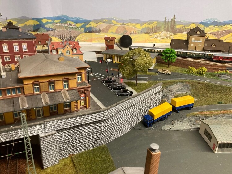 Sehr beruhigend für die Bewohner von Oberlaubach, die Zeiten, wo sie Gefahr liefen durch irgendwelche mysteriösen Löcher in grausige Tiefen zu fallen, sind bald vorüber. Die Administration der Stadt hat das letzte dieser Löcher nahezu geschlossen. Wider Erwarten war durch die Löcher keineswegs aufsteigende Lava zu sehen, sondern eher eine blaumelierte Fläche, für Grundwasser von viel zu flauschiger Struktur. Dennoch für einen Oberlaubacher eine nahezu unvorstellbare Tiefe. Die Gefahr jemals wieder von dort aufzutauchen wurde auch durch gruselige saugende und schlürfende Geräusche vergrößert, die ab und zu unter der Stadt zu hören sind. 🙀🙀 Nun ist die Gefahr nahezu gebannt. Nur noch eine kleine Öffnung ist übrig und die soll auch in sehr naher Zukunft geschlossen werden. Das Gelände ist Teil der Serviceplatte, die Mauer unterhalb des Hofes gehört noch um festen Teil. Hier muss noch angespachtelt werden, mit einer Polystyrolplatte als Trennschicht. Die wird nach der Trocknung einfach rausgenommen. Eventuelle Spalten werden durch Vegetation getarnt. Der Hang zum Sägewerk wird ebenfalls fester Bestandteil, der Übergang von der Straße Teil der Serviceplatte. Eine Aufgabe für Sonntag. Am nächsten WE ist dann großer Fototermin. Unsere Vermietungsgesellschaft bringt seit einiger Zeit eine Reihe in ihrer Hauspostille über ungewöhnliche Aktivitäten ihrer Mieter. Unser Hausmeister, der direkt über uns wohnt und der auch großer Bastler ist, wird am Freitag Vormittag bei der Vorbereitung mit Aufräumen der Anlage helfen. Fertig sein soll die Anlage nicht, aber keine großen Löcher mehr aufweisen. Fotos von der Bauphase kann ich genug beisteuern….🤣🤣😎 Beste Grüße, Ralf p.s. Die Steigung beträgt nebenbei 10%, die Schilder dafür liegen schon bereit. 😀