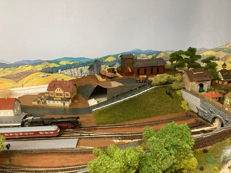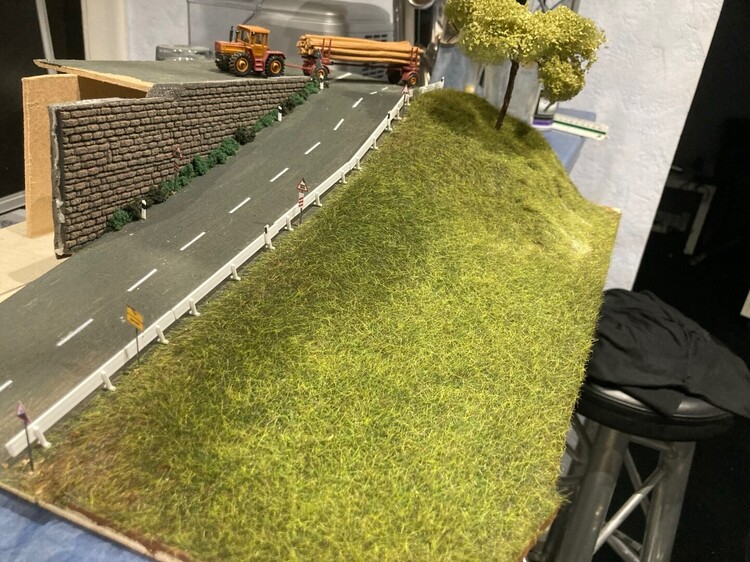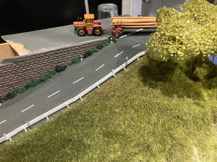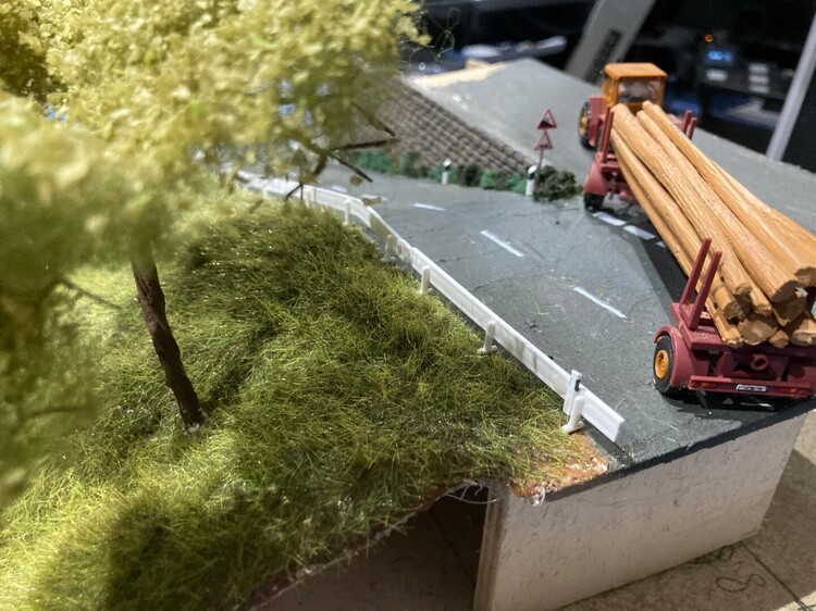 Auch eingesetzt in die Anlage schaut das „Modul“ recht gut aus. Selbst mit dem Baum läßt es sich gut einfädeln. Diagonal von unten durchstecken, über Anlagenniveau heben, in die richtige Richtung drehen und absenken. Langsam macht sich darin Routine breit. 🤣😉 Nochmal raus und das umliegende Gelände noch ein wenig aufgepeppt…. Noch ist eine kleine Lücke mit Felsimitation zu schließen und die Übergänge noch mit Gras zu kaschieren. Wenn nach dem Trocknen der Straße auch die Leitlinien aufgebracht sind wird man kaum noch merken, dass hier ein Teil der Anlage entfernt werden kann. Der andere Teil mit dem kleinen Industriehof wird später noch elektrisch getrennt werden müssen, bevor er herausgenommen werden kann. Hier sind keine Anschlüsse vorhanden, also ein Arbeitsschritt weniger. Beste Grüße, Ralf