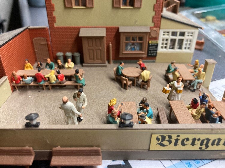 Der Vorortbahnhof ist noch gar nicht ganz fertig, aber gegenüber wird schon gezecht. Die „Gaststätte zur Eisenbahn“ muss aber gerade erst geöffnet haben, denn noch steht kein Maßkrug auf dem Tisch, sie sind aber schon unterwegs. Kaum offen und nahezu alle Außenplätze belegt. So wünscht es sich jeder Wirt. Ob die Küche genauso schnell ist wie die Resi muss sich erst noch herausstellen. Die ersten Bestellungen für das Tagesgericht, den warmen Leberkäse mit Beilagen für 6,50 DM werden wohl nicht lange auf sich warten lassen. 🥴😎 Vor der Platzierung muss der alte Bausatz aber erst noch mit LED Beleuchtung für die Mauerlaternen aufgewertet werden. So was gab es ja beim Kauf des alten Gemäuers noch nicht. 😉 Beste Grüße, Ralf