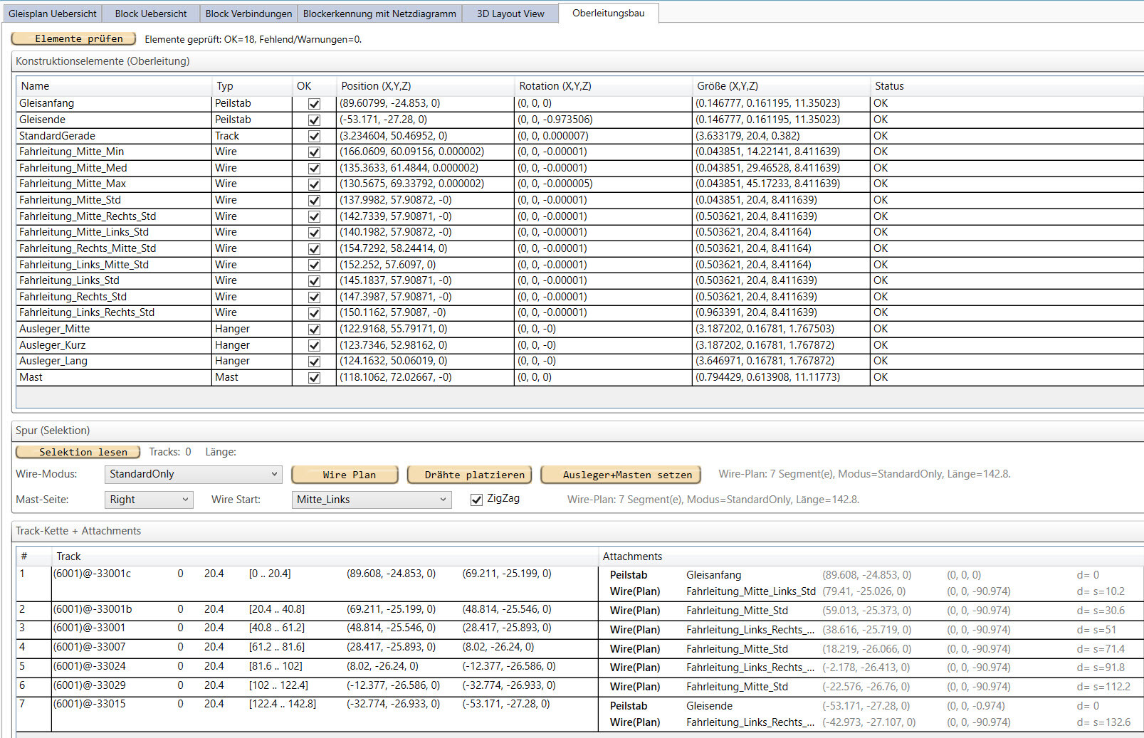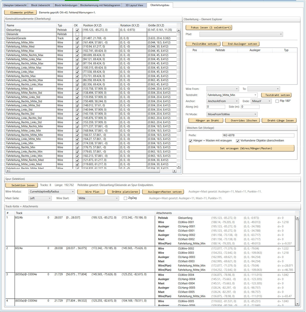 Es gabe einmal ein plugin das masten gesetzt hat nachdem muster, das du hier erwaehnst. Ich hatte mal einen versuch mit dem ich eine tracer lock ueber eine strecke fahren lasse um bloecke usw. zu erkennen. Das funktioniert nicht wirklich, da du meist den kontext (weitblick) nicht hast. Ich habe dann umgestellt einfach die gleisgeometry einzulesen und die komplette anlage zu erkennen und zu zeichnen und dann zu analysieren. Das will ich teilweise fuer die oberleitung verwenden.. Es ist im grunde nur eine frage des datenmodells und der regeln, das zu loesen .. vieles ist natuerlich auch geschmacksache, das ist ok, und man kann auch teilloesungen anstreben. Also zum beispiel peilstaebe fuer vorhandene quertragewerke setzen und automatisch haenger ueber den gleisen plazieren. Es gibt viele kleine hilfen fuer oft zeitraubende manuelle taetigkeiten. Ich bin natuerlich eingeschraenkt mit den moeglichkeiten des MBS uber die schnittstelle, aber auch vorplazierte element bei denen ich nur noch einen draht verlaengern muss da er schnon richtig sitzt ist auch ok. Perfekt wird die loesung sicherlich nicht sein, aber wie du schon ageregt hast, schilder zu integrieren usw., spart schon eine menge konstruktionsaufwand und man kann noch sehr viel mehr zeit in details stecken, wennn solche routinearbeiten erledigt werden. Ich will nicht den "Bauspass" beseitigen, sondern erhoehen, dadurch dass man nicht mit sovielen kleinigkeiten kaempfen muss, und eine oberleitung ist nun mal aufwand. Und vielen dank fuer die vielen anregungen. Gruss gmd