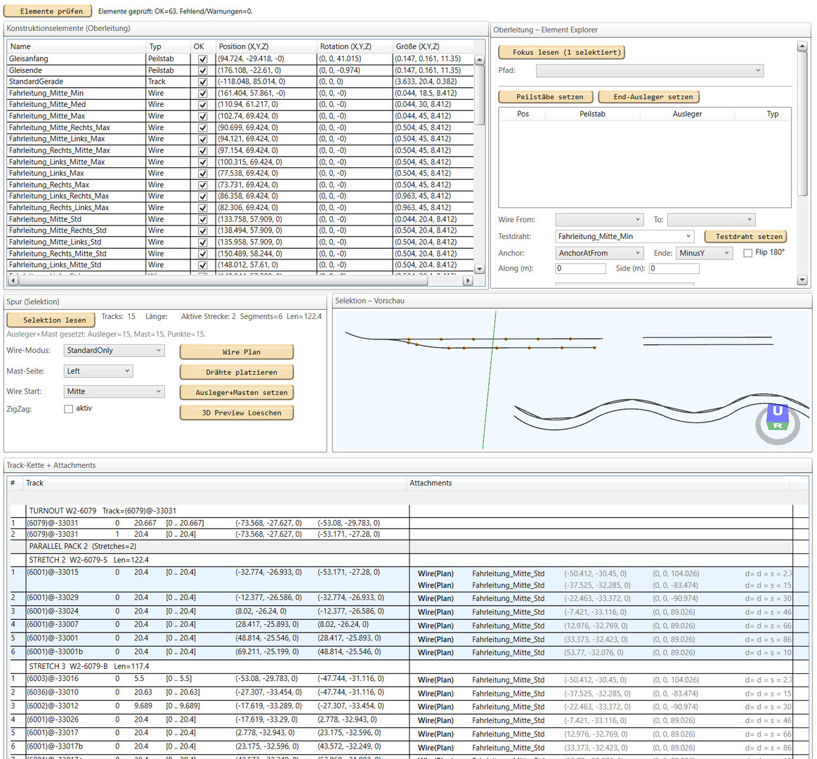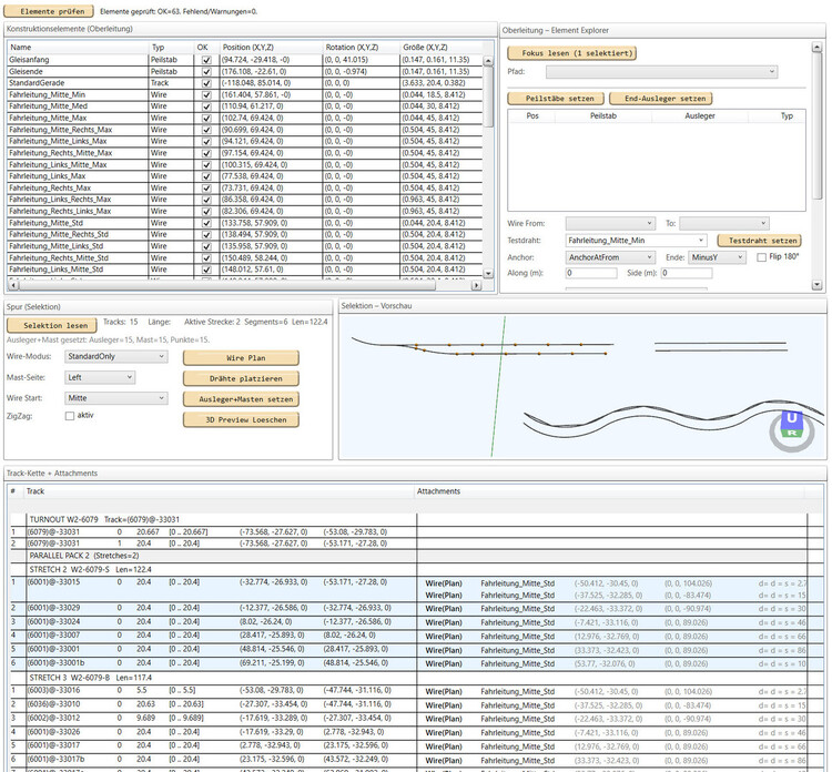 Hallo, habe mir ein testbett gebastelt, wo ich einzelne ueberspannungen ausprobieren kann und laengen festlege mit sicherer abdeckung des stromabnehmers. Kann mit verschiedenen variationen der verwindung testen, mit kurzen und langen auslegern. Die ergenisse kann ich als fallstudien aufheben und dann im konstruktionsbetrieb aufrufen. Auf diese weise versuche ich optimale laengendefinitionen zu finden, da ich ja die laenge nicht dynamisch einstellen kann. Der ein oder andere manuelle eingriff wird da nicht ausbleiben. Gruss gmd