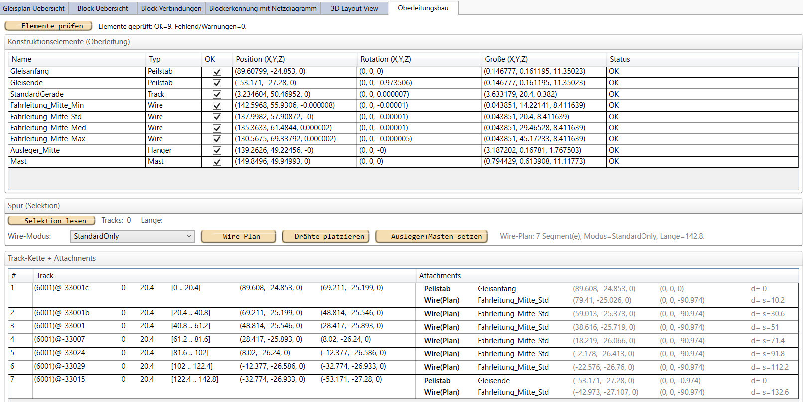 Hallo nochmal, der erste schritt fuer die oberleitung ist gemacht. Wie Waterman vorgeschlagen hat, habe ich erts mal ein paar elemente bereitsgestellt. 4 draehte min,standard,medium und max und ein haenger und ein mast .. alles gerade und mittig als anfang Habe mir eine testumgebung gebaut, in der ich alle datane anzeige und kontrolle habe was passiert und werde jetzt stueck fuer stueck die plazierungsstrategien angehen. Hier pruefe ich erst mal ob auf der anlage die notwendigen bautaile vorhanden sind. Die links und rechts draehte muessen ja als variationen angelegt werden und koennen nur ueber namen gecloned werden. Das kommt als naechstes. Ich habe verschiedene "Wire Plans" die je nach context verwendet werden, hier zunaechst "Standard"> Im bild sieht mna, dass die masten auf der falschen seite sitzen, dafuer habe ich noch keinen parameter und da ich derzeit nur eine strecke einlese, erkennt das programm noch nicht die parallelstrecke. Das kommta ber alles, da ich ja die komplette streckenerkennung fertig habe . Hier entwickele ich nur die grundelemente fuer den oberleitungsbau, die dann auf das gesamtmodell angewendet werden. Ich habe vor auch quertragewerke, zumindest teilweise zu automatisieren. Wie ich schon mehrfach sagte, allmaehlich kommt alles zusammen, da ich alle prinzipiellen programmteile schon mal verwendet und getestet habe, so sind jetzt die weiteren dinge ableitungen. Allerdings bleiben immer noch viele aspekte zu erledigen, es sind einfach viel features, die ich noch vorhabe einzubauen. Die landschaftsgestaltung, die oberleitung und die steuerung sind einfach zeitraubend bei groesseren anlagen oder vielen anlagenteilen. Gruss gmd