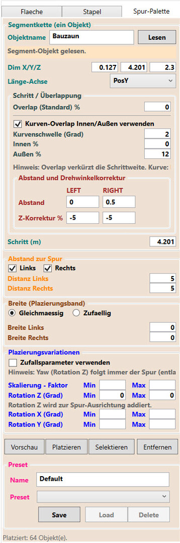 Hallo, bei der Hecke war es noch einfach eine kurve zu erzeugen, man kann einfach ueberlappen, aber mit anderen objekten ist das schwieriger .. Mit dem bauzaun muss man schon etwas genauer plazieren, aber das geht jetzt auch. Sind ne menge parameter geworden, hatte versucht das komplett automatisch zu machen, das hat aber einige faelle verhindert. Mit parametern muss man zwar etwas mehr einstellen aber man kann variationen besser nutzen, also auch zufaellige abweichungen erzeugen usw. Ich habe ja presets die ich abspeichern und wieder abrufen kann. Die kann ich dann als grundlage verwenden und variationen leichter erzeugen. Gruss gmd