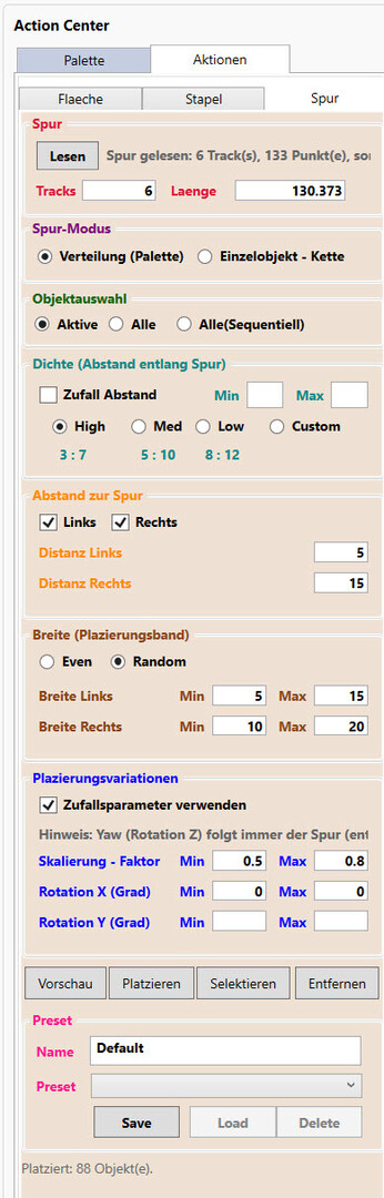 Hallo, hier die beiden varianten, positionieren entlang beliebiger spur von einer palette von objekten, oder einzelobjekte als kette. Es fehlen noch parameter, die ich noch ergaenze .. ich will die dichte links und rechts von kurven kompensieren. bzw. definierbar machen. dann ist das auch fertig. Und die rotationsparameter habe ich noch vergessen fuer die plazierung. Gruss gmd