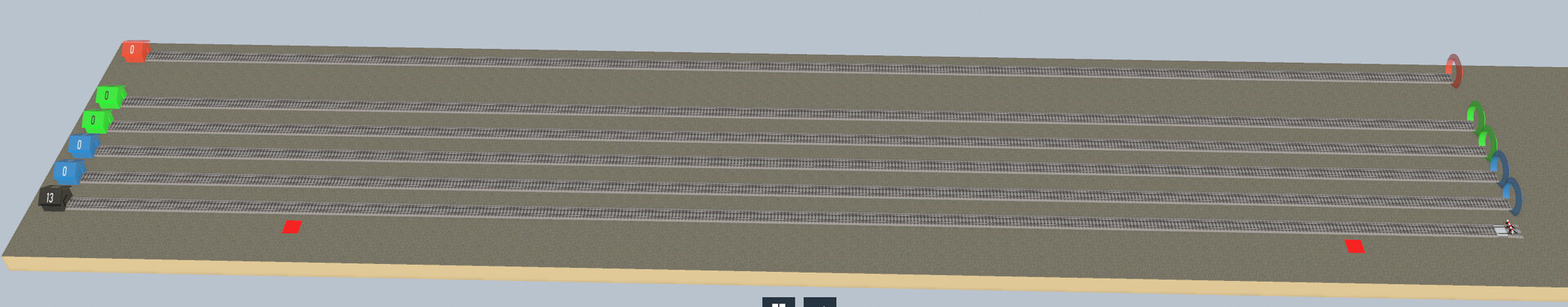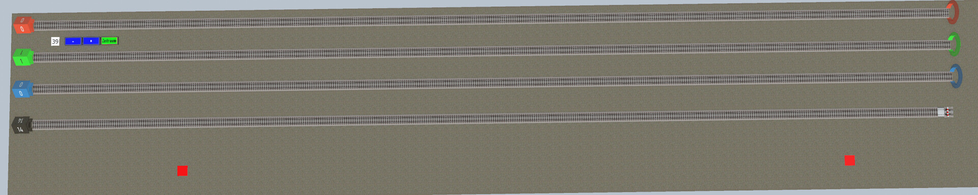 Das Schattenreich – Die Steuerung Auf einem kleinen Extrabrett wird alles gesteuert - im Vordergrund das schwarze Sammeldepot enthält alle Züge und der angeschlossene Gleisabschnitt davor dient ausschließlich zum Aufgleisen der Züge. Deswegen gibt’s am Ende auch kein Portal. Aus dem Sammeldepot fährt kein Zug auf die Strecke, sondern dient nur als Stellplatz für alle Züge die auf der Anlage fahren sollen. Die beiden roten Platten dienen als Orientierung wie lang der Zug sein soll, damit er auf die Bahnhofsgleise passt. Zwar kennt man die Länge mit etwas Übung, aber beim Aufstellen von kurzen Güterzugwagen ist es immer noch ganz hilfreich. Zunächst hatte ich pro Strecke zwei Depots aufgestellt (In/Out) – beim Code schreiben hab ich aber festgestellt, dass pro Strecke nur ein Depot reicht. Weil ja stets nur ein Zug auf der jeweiligen Strecke fährt und auch in der echten Eisenbahn zwischen zwei Zügen etwas Sicherheitsabstand ist – so dass man in dieser Zeit bequem die Züge wechseln kann. FV-Strecke (Fernverkehr Orange): Auslöser für den Zugverkehr ist das Ereignis … wenn ein Zug ins FV-Depot fährt … dann … Bevor der Zug ins FV Depot fährt ist das Depot leer … Wenn der Zug ankommt wird er sofort mit $("XDepot"):add(vehicle) ins Sammeldepot (XDepot) verschoben, sodass FVDepot wieder leer ist. Mit defer wird eine kurze Wartezeit erzeugt, bevor dann die Anzahl der Züge im Sammeldepot ermittelt wird und per Zufall ein Zug ausgewählt wird, der wieder auf die Strecke geschickt wird . Mit Release wird er allerdings nicht vom Sammeldepot, sondern direkt wieder vom FVDepot losgeschickt if not deferredCall then defer(5, "Verzögerung") elseif deferredCall == "Verzögerung" then local zugAnzahl = $("XDepot").count local rndIndex = math.random(1, zugAnzahl-1) $("XDepot"):release(rndIndex,$("FVDepot")) end Sofort nach dem Losschicken wird noch per Zufall das Ausgangsportal mit einem der beiden Portale der FV Strecke verbunden – so dass man vorher nicht weiß ob der Zug von Ost nach West oder von West nach Ost fährt local rnd = math.random(1,2) if rnd == 1 then $("FVDepotPortal").connection = $("FVOstPortal") print (" FV Ausfahrt Ostportal") elseif rnd == 2 then $("FVDepotPortal").connection = $("FVWestPortal") print ("FV Ausfahrt Westportal") end Wenn der Zug am Ende der FV-Strecke angekommen ist, stellt ein Gleiskontakt am Ende wieder die Verbindung vom FVDepot-Portal her z.B. $("FVWestPortal").connection = $("FVDepotPortal") - Und der Zug fährt zum FVDepot und das ganze beginnt von vorne Im Prinzip funktioniert es - aber es hakelt noch manchmal wenn der gleiche Zug der gerade eingefahren ist per Zufall sofort wieder rausfahren soll – und im Normalbetrieb läuft der Code auch für die Strecken NV-Verkehr und PR-Strecke, da muss ich mir noch was überlegen damit es sich nicht überschneidet, wenn mehrere Züge kurz hintereinander ins XDepot kommen. Und ein paar andere Spielereien hab ich auch noch im Kopf – aber dazu später mehr