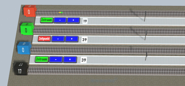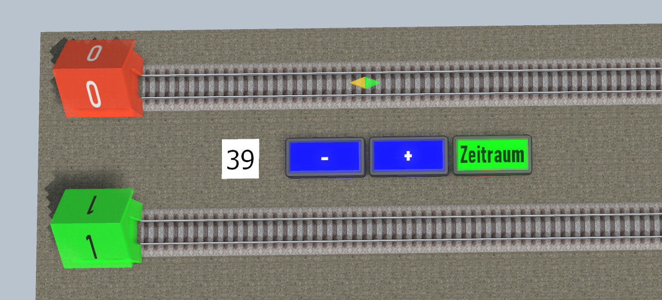 Das Schattenreich – Die Steuerung ***update*** Mal ein wenig aufgeräumt – nur noch ein Depot pro Strecke Die Auswahl des Zuges aus dem XDepot angepasst – auch in Hinblick auf die noch kommende Bahnhofsstrecke. local rndIndex = math.random(0, zugAnzahl-5) $("XDepot"):release(rndIndex,$("FVDepot")) Jetzt werden die letzten 5 der XDepot-Liste ausgelassen – mehr werden wohl nicht gleichzeitig in kurzer Zeit ins Depot fahren Außerdem zunächst für die FV-Strecke ein Textfeld – 2 Taster und ein Schalter hinzugefügt. Eine Variable FVTimer hinzugefügt – die die aktuelle Wartezeit bestimmt Mit dem Taster kann man jeweils die Wartezeit hoch und runter stellen was parallel im Textfeld angezeigt wird. + Taste if $("Ereignisse").variables["FVTimer"]<45 then $("Ereignisse").variables["FVTimer"] = $("Ereignisse").variables["FVTimer"] + 1 end $("FVText").text=$("Ereignisse").variables["FVTimer"] Mit dem Schalter Zeitpunkt/Zeitraum kann man den Modus ändern Zeitpunkt bestimmt die feste Wartezeit – also bei 39 wird alle 39 sec ein neuer Zug gestartet Bei Zeitraum wird per Zufall zwischen zwischen 3 und 39 eine Zahl ausgewählt – dh der Zug kann nach zB 3 15 25 oder 39 sec losfahren je nachdem was ausgewürfelt wird. rndFVT = math.random(3, $("Ereignisse").variables["FVTimer"]) Der Auswahlbereich ist zwischen 3 und 45 sec. festgelegt je nachdem was man einstellt So kann ich die Frequenz auf der FV Strecke bestimmen mit der dort der Zugverkehr stattfindet