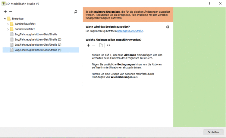 Hallo liebe Gemeinde, ich bin noch Neulung in 3d-Modellbahn V7. Ich lege Ereignisse an, ab dem vierten Ereignis kommt diese Meldung: Wo mache ich den Fehler? LG Bernd